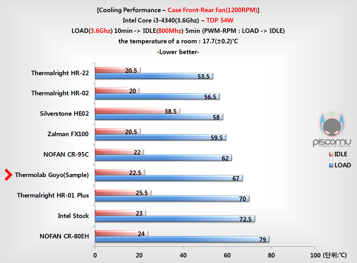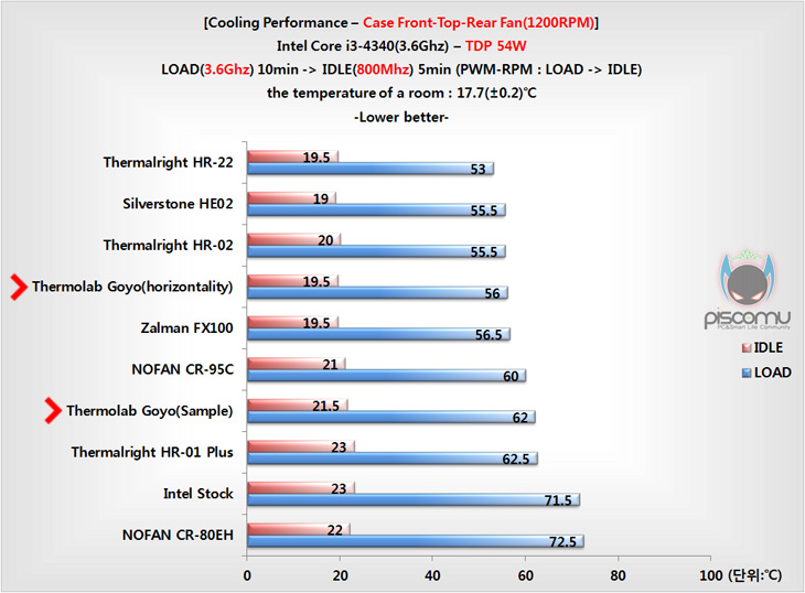 이번엔 실제 케이스 내부에 장착한 상태에서 고요(Goyo) 냉각 성능을 확인해보는데, 현재 국내 케이스 트랜드를 생각해 전면, 상단, 후면 모두 팬을 장착한 상태에서 상단 팬은 일부 케이스에서 옵션으로 미제공 되는 경우가 있기 때문에, 전면과 후면 팬 작동 시와 전면, 상단, 후면 모두 작동 했을 시 2가지 경우로 진행했습니다. 팬 속도는 모두 1200RPM대로 설정했습니다. 또한, 쿨러의 방향을 기본 수직 외에 수평으로도 장착을 해서 진행을 하는데, 이때 메모리 슬롯 중 CPU와 가까운 쪽 2개의 슬롯 간섭이 발생하기 때문에 방열판이 적용된 메모리 사용 시에는 미리 확인을 해야하겠습니다. 먼저, 전면과 후면 팬이 작동했을 시 냉각 성능을 확인해 본 결과, 준수한 성능을 보여줬는데, 앞서 기본 오픈 케이스 테스트에서 통과하지 못했던 것과 달리 케이스의 팬 영향을 많이 받는 것을 확인할 수 있습니다. LOAD 상황은 비교모델들 중 중간으로 무난하며, IDLE상황에서의 냉각 성능은 낮은 편에 속에 LOAD보다 IDLE에서의 냉각 처리가 더 좋음을 알 수 있습니다.