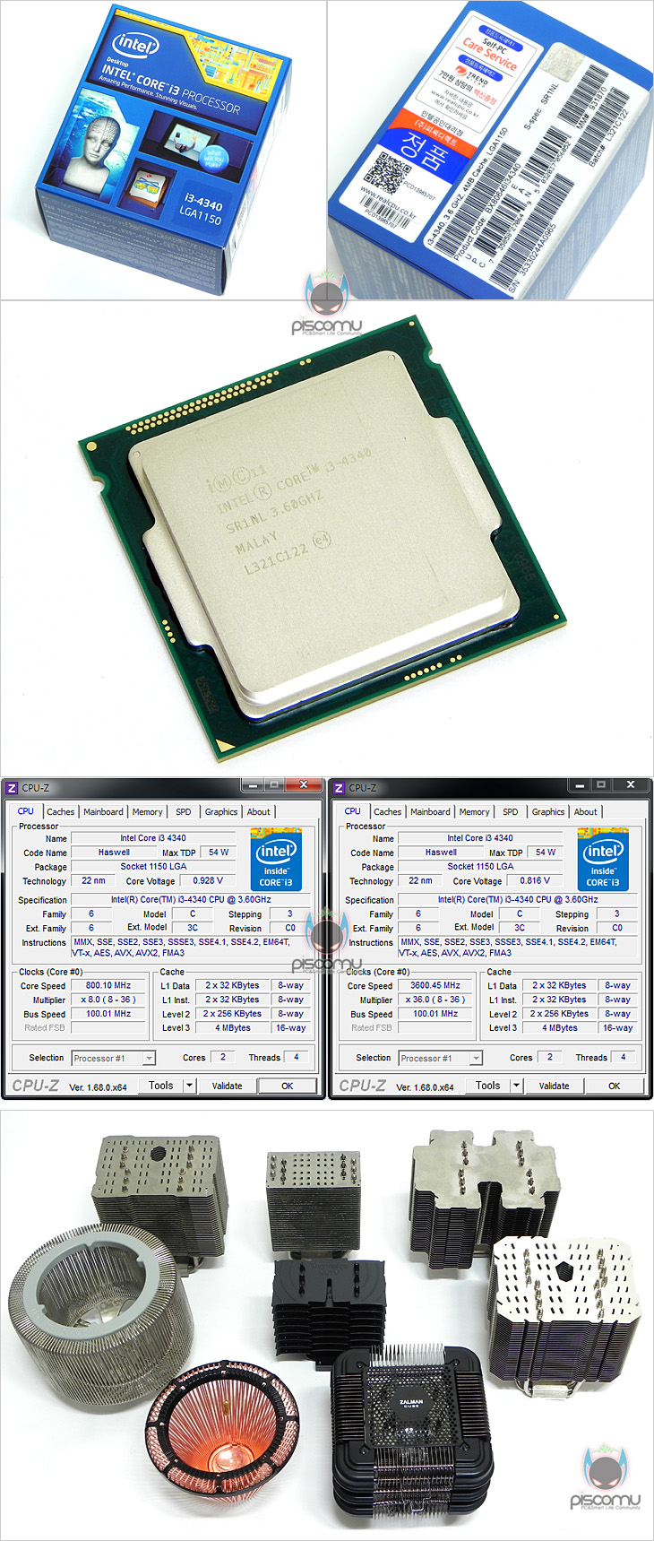 이제, 고요(Goyo)의 성능을 확인해보는데, 제조사 확인결과 현재 고요(Goyo)의 팬리스로 TDP 한계는 60W입니다. 따라서, 프로세서는 인텔 최신인 하스웰로 그 중 TDP54W를 가진 모델 듀얼코어에서 가장 상위 모델인 3.6GHz 클럭의 i3-4340을 선택했습니다. LOAD에서 3.6GHz, IDLE에서 800Mhz으로 작동됩니다. 고요(Goyo)를 포함 쿨러는 총 8개입니다. 모두 팬리스 컨셉이기 때문에 팬 장착에 따른 성능 진행은 하지 않았습니다.
