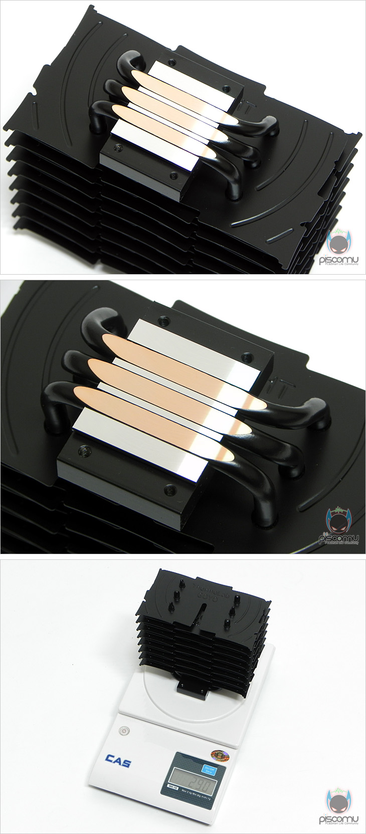 히트파이트는 총 3개 적용으로 앞서 U자형 구조임을 확인했으며, 히트파이프 역시 블랙 도금 처리가 되어 있습니다. 그리고, CPU와 맞닿는 베이스 부분은 히트파이프에 바로 접촉되는 D.H.T(Direct Heatpipe Touch) 방식으로 전도율을 높였습니다. 래핑 상태는 매끄럽게 잘 되어 있습니다. 그리고, 쿨러의 무게는 약 290g으로 팬리스 쿨러로썬 매우 가벼운 무게에 속합니다.