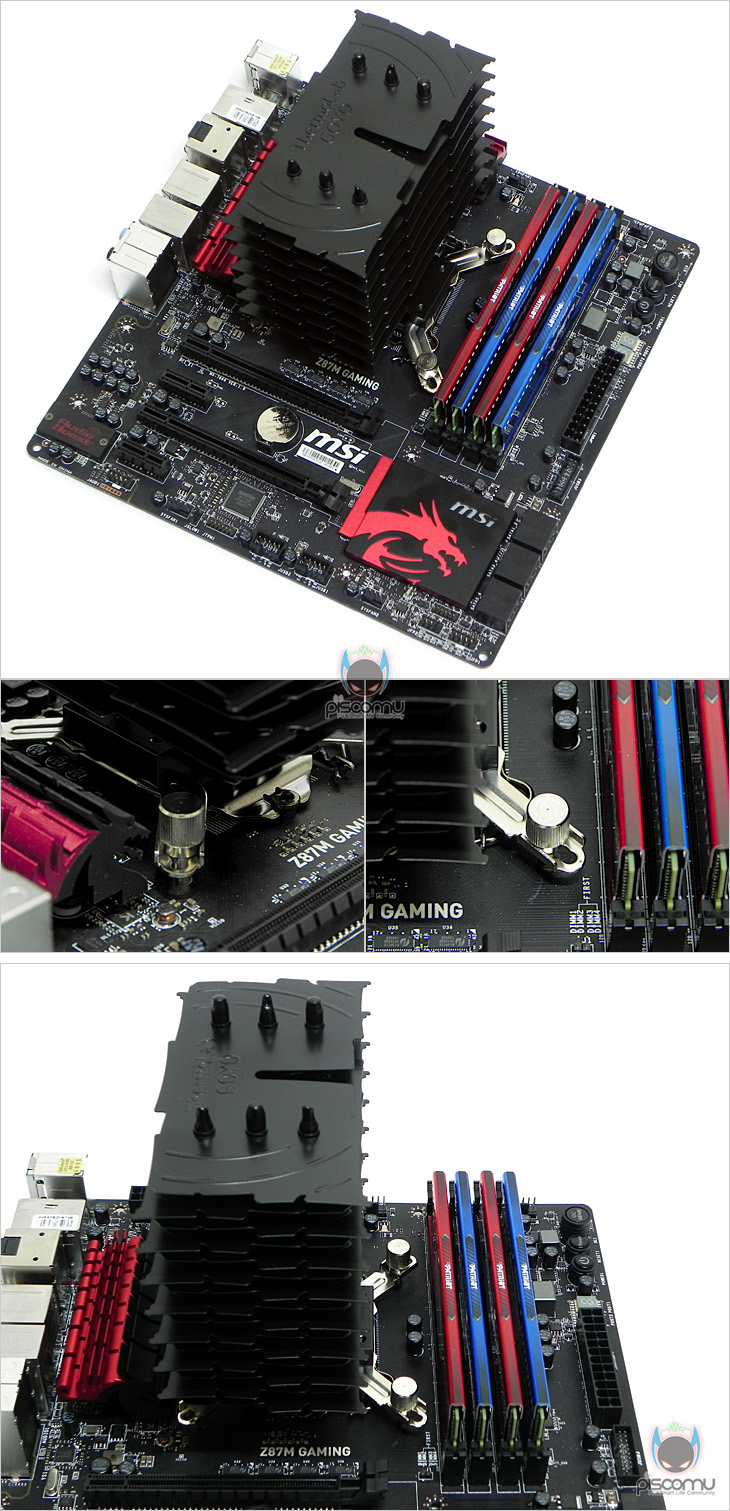 이 후, 쿨러를 메인보드에 올리면서 마지막으로 핸드너트를 사용해 고정하면 장착이 끝납니다. 언급했듯이, 기존 모델들과 동일한 방식이기 때문에 어려움은 없겠습니다. 쿨러 장착 후, 간섭 여부를 살펴보면, 메모리 슬롯과 PCI슬롯 모두 간섭 발생은 하지 않겠습니다.