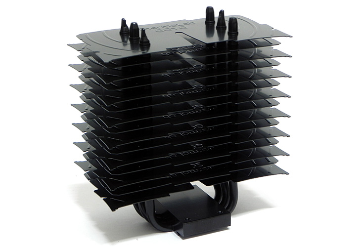 시작에서 말했듯이 아직 개발 단계로 제품 박스는 없으며, 바로 샘플 쿨러를 살펴보겠습니다. 쿨러의 색상은 전체 블랙 도금으로 처리가 되어 있습니다. 쿨러 제원에 대해 아직 정확히 공개되지 않았지만, 쿨러 높이는 약 135mm, 폭 약 125mm, 깊이 약 66mm를 가졌습니다. 자사의 바다(BADA) 쿨러보다 약간 큰 사이즈입니다. 히트파이프 구조 역시 바다/트리니티와 비슷한 구조를 가졌습니다. 방열핀은 양쪽 홈처리를 통해 추가 팬을 장착할 수 있게 지원하고 있으며, 가운데 부분에는 제조사와 모델명이 새겨져 있습니다. 그리고, 방열핀 구조는 동일한 디자인을 방향만 반대로 해서 올라간 구조로 총 15개가 적용되었으며, 핀 간의 간격은 약 6mm로 그 동안의 팬리스 쿨러들과는 달리 간격 폭이 넓은 편입니다.