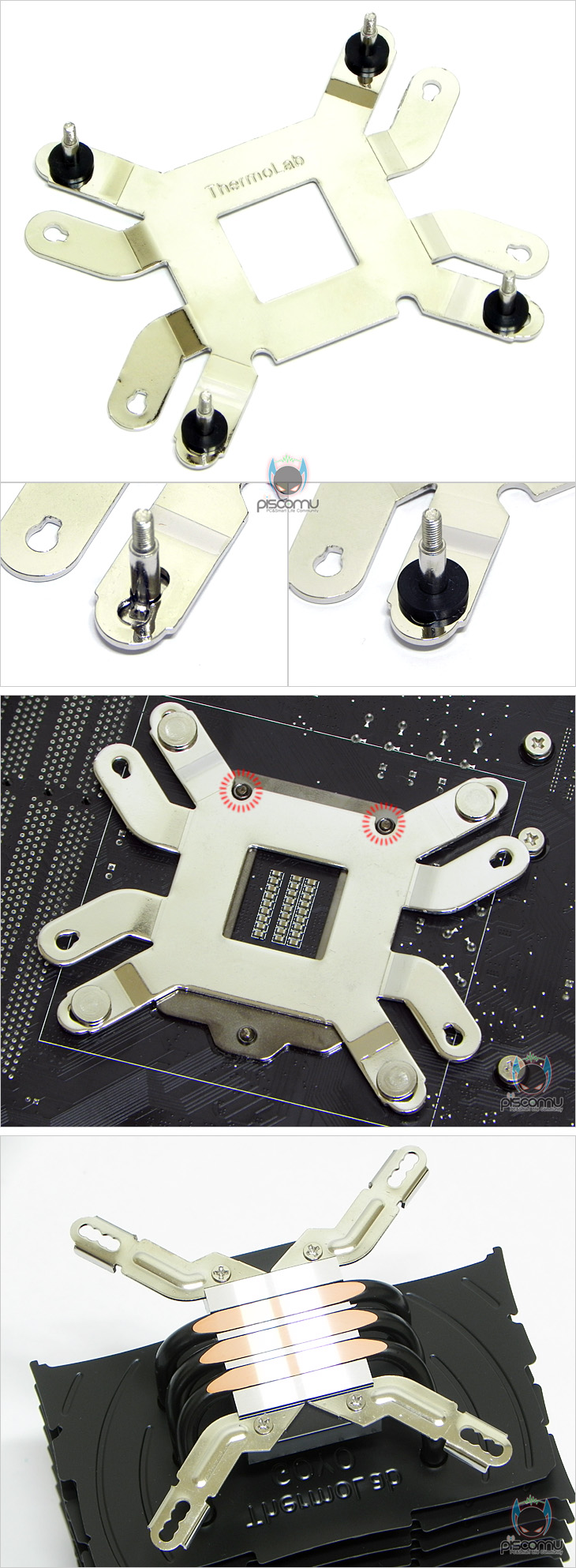 직접, 고요(Goyo)를 사용해 보겠습니다. 먼저, 장착에 대해 언급하면, 아직 제품 개발 단계이기 때문에 장착 방법은 제조사의 이전 모델들 바다, 바람, 트리니티와 동일한 장착법을 가지고 있습니다. 기존 모델들에서도 모두 통합 방법이었기 때문에, 정식 출시가 되어도 장착 방법은 변화가 없을 것으로 생각됩니다. 먼저 백플레이트에 자산의 프로세서 소켓에 맞춰 고정볼트를 고무와셔를 사용해 고정해줍니다. 그리고, 메인보드 후면 방향에 맞춰 끼웁니다. 그리고, 쿨러에 장착되는 클립은 권장설치의 4개 동일한 클립과 스마트 설치에 적용되는 한쪽 일체형 클립이 있는데, 선택한 설치 방법에 따라 쿨러에 고정해줍니다.