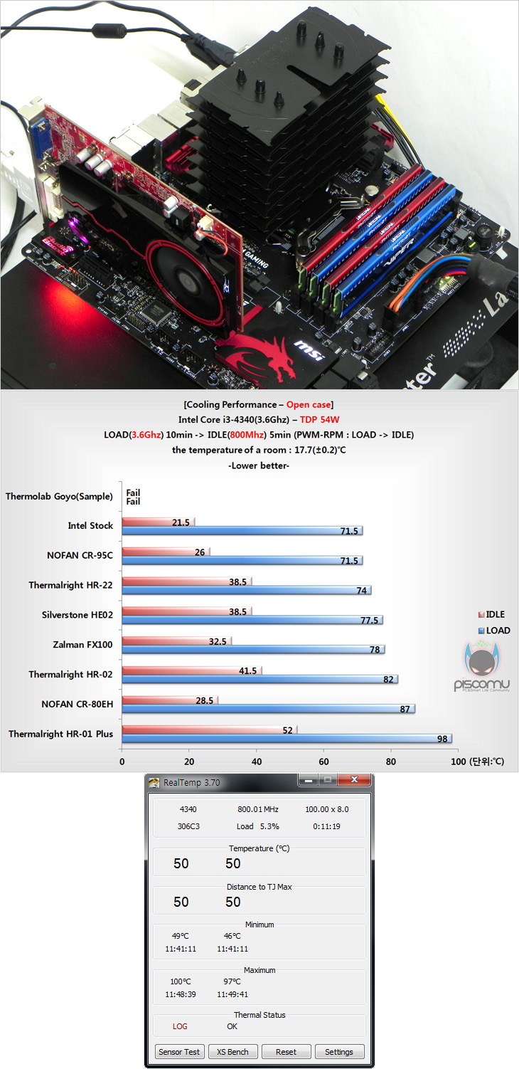 먼저, 기본 벤치로 오픈 케이스 형태에서 성능 확인을 해보는데, Prime95를 10분간 실행한 LOAD 상황 후 5분간 IDLE로 돌아가는 진행이 되겠는데, 고요(Goyo)는 테스트를 통과하지 못했습니다. LOAD 10분을 채우지 못하고 100℃에 도달했기 때문에, CPU 손상우려가 있을 수 있어 중단되었습니다. 실제, 제조사에서도 수평인 시스템 즉, 메인보드가 수평으로 놓이는 HTPC나 테스트형 오픈 케이스 형태에선 팬이 전혀 없는 경우에서 사용 불가하다고 언급을 하고 있습니다.