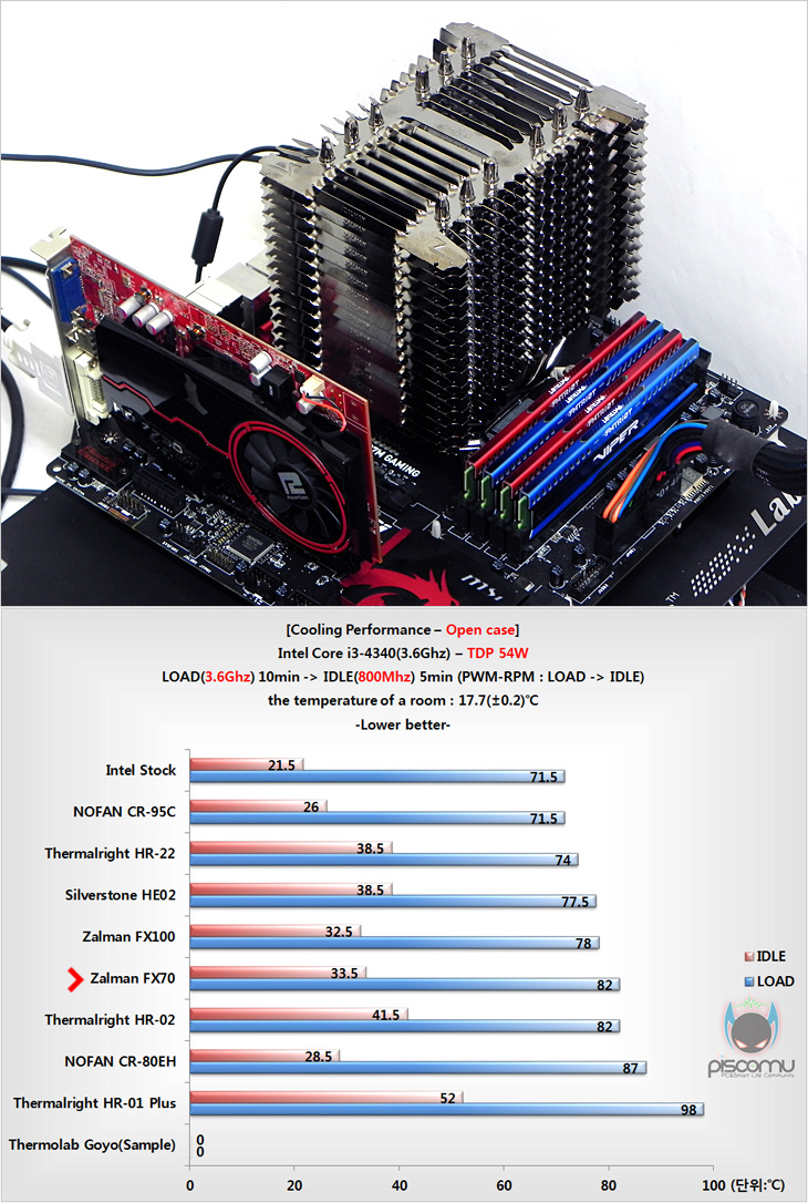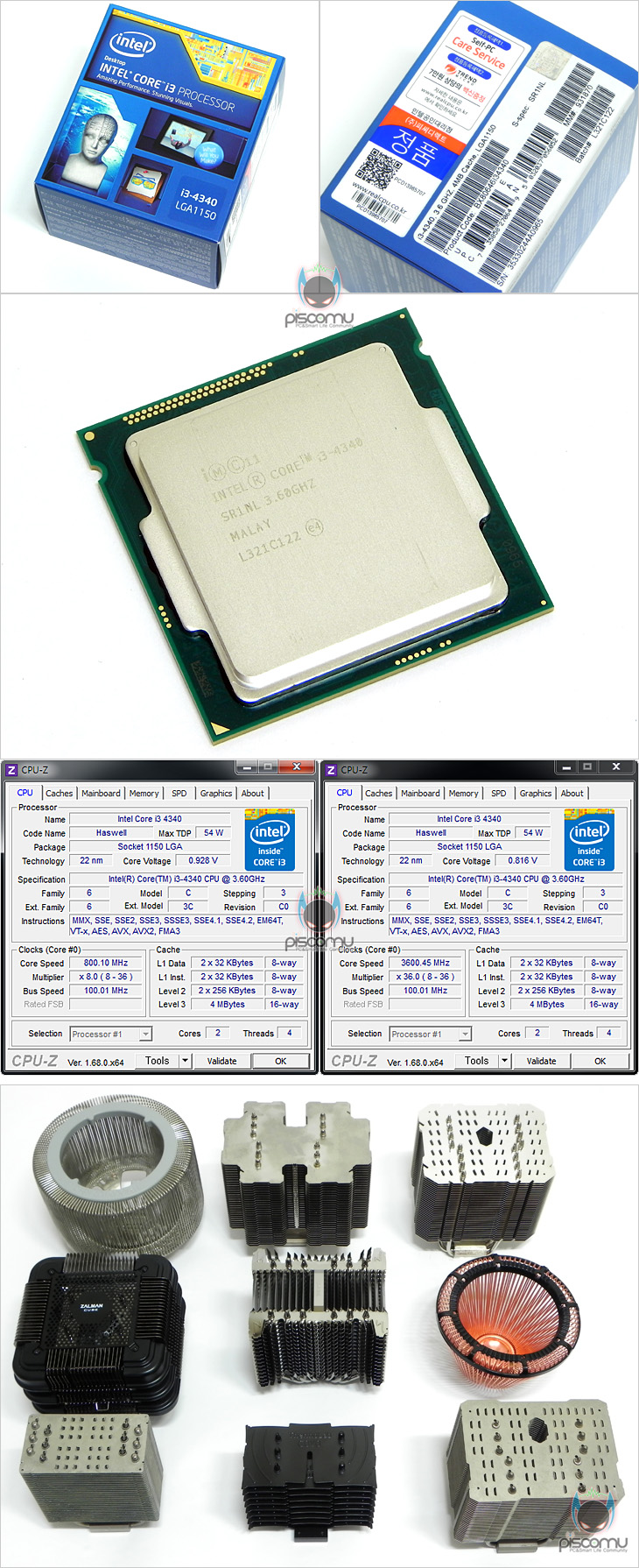 이제, FX70의 냉각 성능을 확인해보는데 FX70의 팬리스 상태 TDP 최대는 80W로, 현재 인텔 최신 프로세서 하스웰 경우 듀얼코어 모델은 TDP 54W, 쿼드코어는 84W입니다. 따라서, FX70 및 비교 팬리스 쿨러 모두 테스트 통과를 위해서 프로세서(CPU)는 TDP 54W인 하스웰 듀얼코어 기반에서 가장 상위 모델 i3-4340(3.6GHz) 모델로 선택했습니다. 작동은 LOAD시 3.6GHz, IDLE시 800Mhz으로 작동되며, 진행은 Prime95 10분 실행의 LOAD후 5분간 IDLE로 돌아가는 진행이 되겠습니다.
