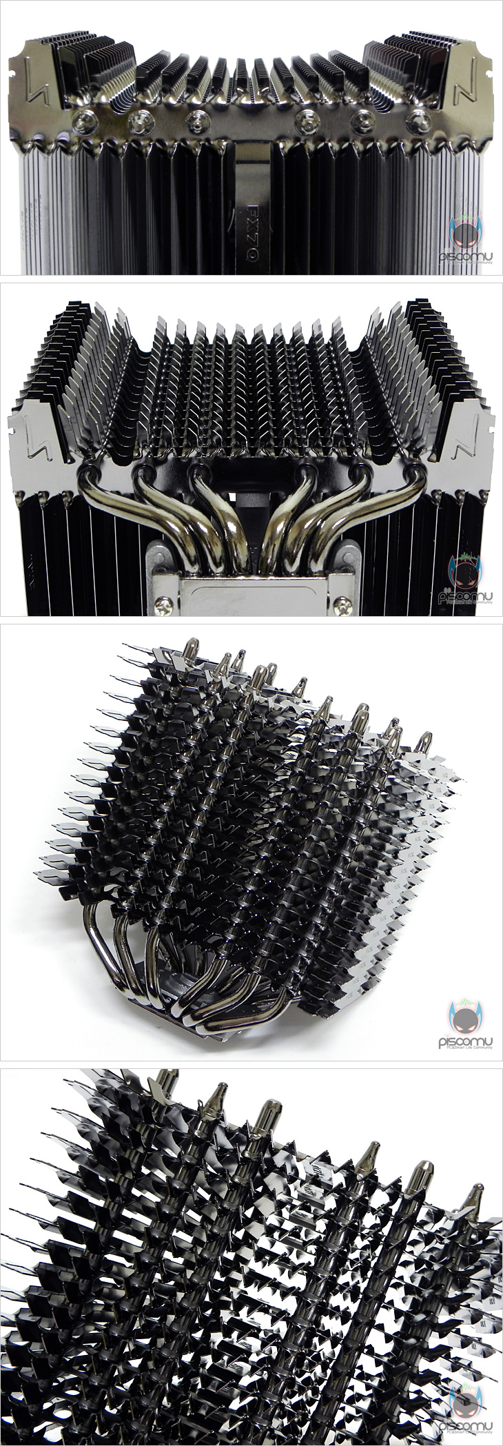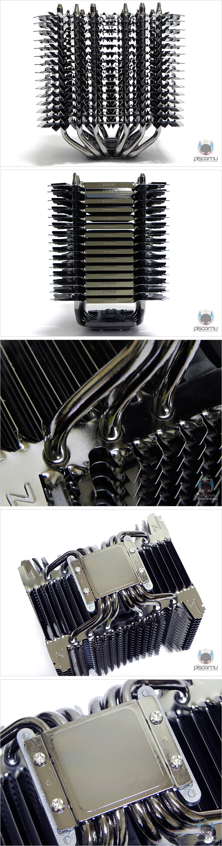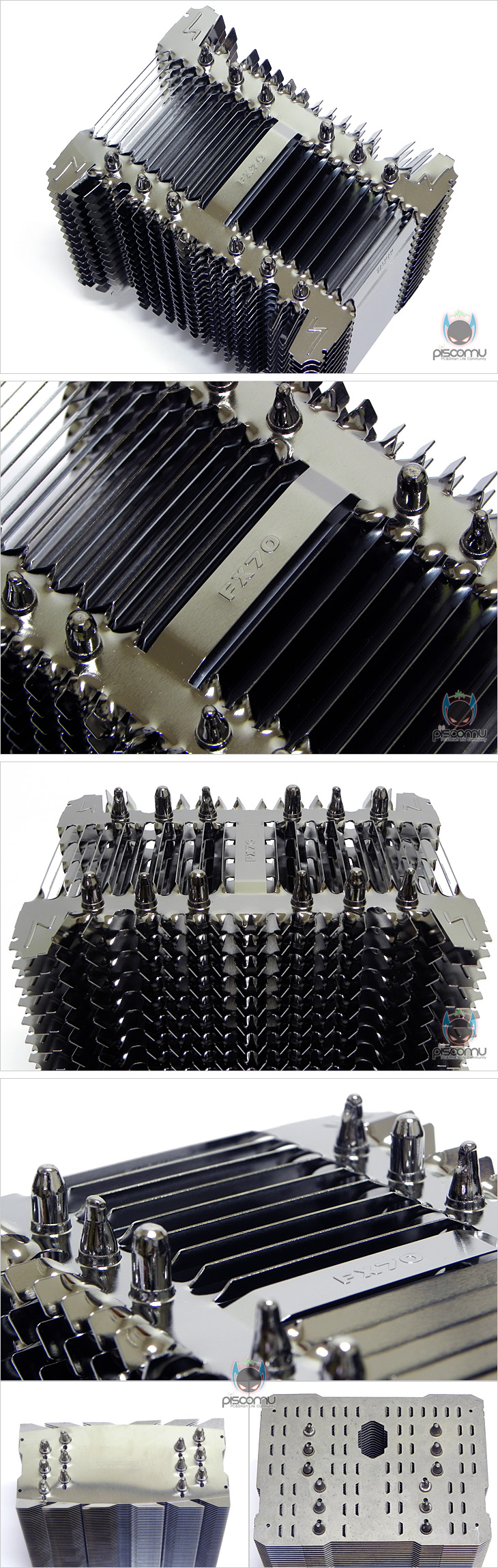 전체 쿨러의 방열핀 형태를 보면 공기 유입이 가운데로 집중될 수 있도록 오목한 형태를 가진 것을 확인할 수 있습니다. 방열핀은 총 15개가 적용되었습니다. FX70이 제품 컨셉은 팬리스(Fanless)지만, 앞서 구성품에서 확인했듯이 추가로 팬을 장착할 수 있게 팬 클립을 제공해줍니다. 쿨러 방열핀 양쪽에 클립을 장착할 수 있는 홈이 있기 때문에, TDP 한계가 80W인 FX70에서 그 이상의 고성능 CPU를 사용할 시에는 추가 팬을 장착해 사용하면 되겠습니다. 히트파이프는 총 6개 적용으로 지름 6mm 재료를 사용했으며, 타워형 쿨러에 적용되는 U자형 구조를 가졌습니다. 방열핀과의 통과 방식은 관통식으로 처리되었습니다. 끝으로, CPU와 맞닿는 베이스 부분은 매끄럽게 잘 래핑처리가 되어 있습니다. 히트파이프, 베이스 모두 방열핀과 동일하게 흑진주 니켈 도금처리가 되어 있습니다.