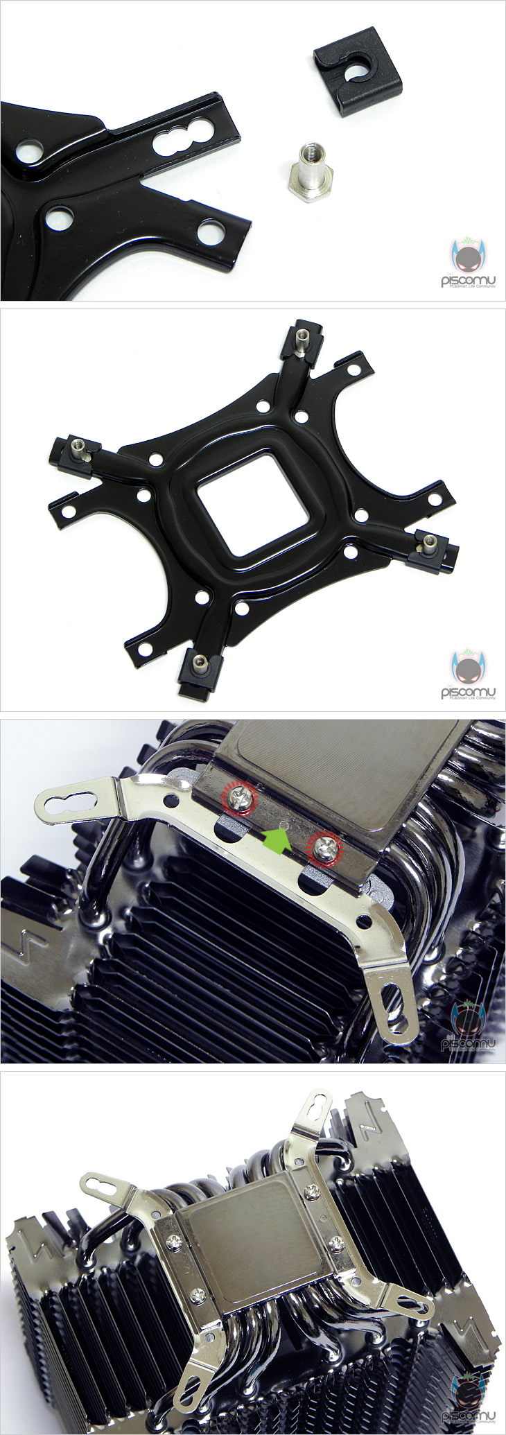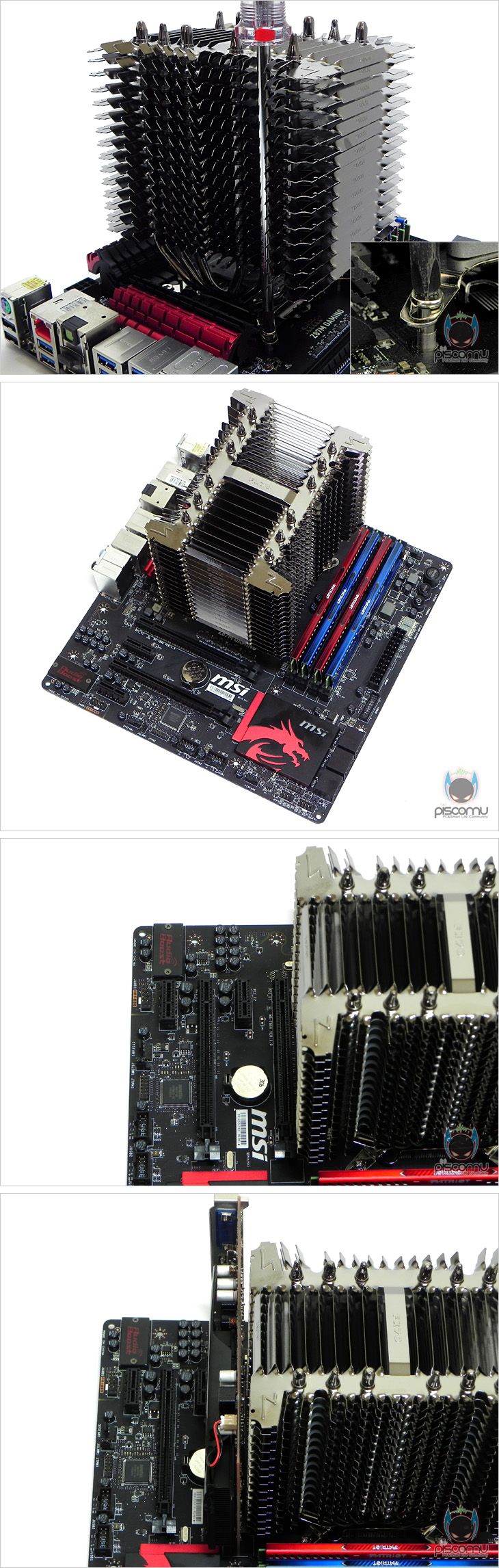 이제, 장착을 해보는데, 장착 방법은 기존의 제조사 제품들과 동일한 형태이기 때문에 큰 어려움은 없습니다. 제공되는 설명서나 제조사 홈페이지의 매뉴얼을 참고하면 어렵지 않게 장착할 수 있습니다. 먼저, 백플레이트에 사이드 캡과 너트를 자신이 사용하는 프로세서 소켓에 맞춰 결합해줍니다. 여기선 소켓 LGA 1156 기준으로 설치 진행합니다. 그 다음 쿨러 베이스 양쪽에는 역시 자신의 프로세서 종류에 따라 인텔용과 AMD용 클립을 사용해 결합해줍니다. 그 다음, 쿨러를 그대로 올려 앞서 구성품에서 언급한 프로세서별로 고정 볼트를 선택해 공구 드라이버로 체결하면 쿨러 장착이 마무리됩니다. 장착 후 간섭 여부를 확인해보면, 일단 일반적인 수직방향으로 장착했을 시, 2번 슬롯은 당연히 간섭이 발생하지 않으며, 메인보드 PCI슬롯 1번 하고는 아슬아슬하게 닿지 않습니다. 그래도 무난하게 장착을 고려한다면, VGA가 2번 슬롯에 장착되는 메인보드를 선택하는 것이 무난하겠습니다.
