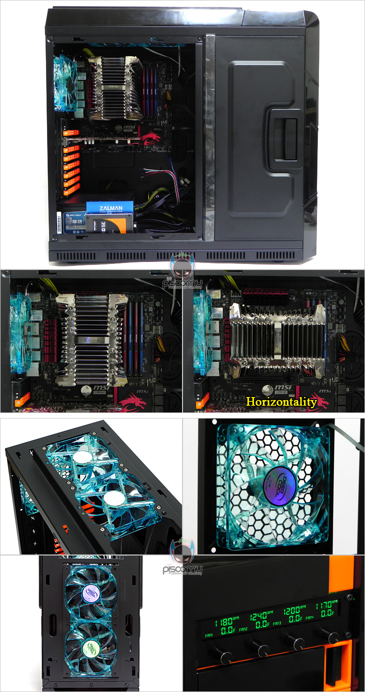끝으로, 전면, 후면, 상단 팬까지 작동되는 상황에서의 FX70 성능은, 확인 결과 좀 더 온도가 낮아져 쿨링 효과가 더 좋아졌음을 확인할 수 있고, 간섭이 더 적은 수평(Horizontality) 장착 역시 수직과 성능이 동급이거나 조금 좋은 편이라, 만약 메인보드 슬롯 1번에 VGA를 장착해야 하는 상황이라면 수평으로 장착해도 좋겠습니다. 성능은 LOAD에선 두 번째로 낮은 온도, IDLE에선 가장 낮은 온도를 보여 둘 다 성능에선 만족스럽고, 이전 FX100보다 더 좋은 효과를 보였다라는 점에 역시 제품 핵심인 트위스트 히트싱크 설계가 한몫을 하고 있다 볼 수 있겠습니다. 또한, 동급 성능이 모델들보다 크기가 작다라는 점과 무게 역시 절반(530g) 정도라는 점에서 제품의 매력은 더 높다 할 수 있습니다.