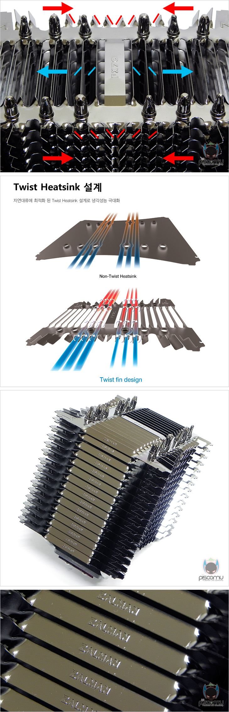 모양새는 기본적인 타워형 쿨러지만, 앞서 말했듯이 이번 모델은 팬리스 쿨러이기 때문에 핵심을 방열핀에 있습니다. 방열핀 가운데 각인된 모델명을 기준으로 가운데 부분이 개폐형태의 홀 처리가 되어 있습니다. 특히, 기존의 다른 팬리스 쿨러들이나 기본 타워형 쿨러들은 작은 구멍 형태의 홀 모양이나 홀이 없는 민무늬가 주로지만, FX70은 큼지막하게 핀 가운데 즉, 마주보는 히트파이프 사이 공간을 전체적으로 홀 처리를 했다는 것이 특징입니다. 그리고, 방열핀 외곽쪽 핀 방향은 가운데 홀 처리된 핀 방향과 반대로 되어 있는데, 가운데 홀 처리된 핀 방향이 바깥쪽으로 가는 반면, 외곽쪽 핀 방향은 안쪽으로 모이는 형태를 가지고 있습니다. 이는 이번 모델의 핵심 기술로 제조사에선 트위스트 히트싱크(Twist Heatsink)라 언급하고 있습니다. 즉, 일반 민무늬 형태의 방열핀이 히트파이프 사이를 통과하는 공기 흐름 속도보다 핀의 방향을 각각 번갈아 가면서 주는 형태로 회전력 같은 흐름으로 좀 더 빨리 흐름 속도를 높여 열 발열을 신속히 한다라는 컨셉이 되겠습니다. 또한, 방열핀 측면에 가운데 부분은 양쪽으로 공기 흐름과 열 배출이 되지 않게 쉴드 형태로 처리가 되었으며, 각 쉴드 표면에는 제조사명이 각인되어 있습니다.