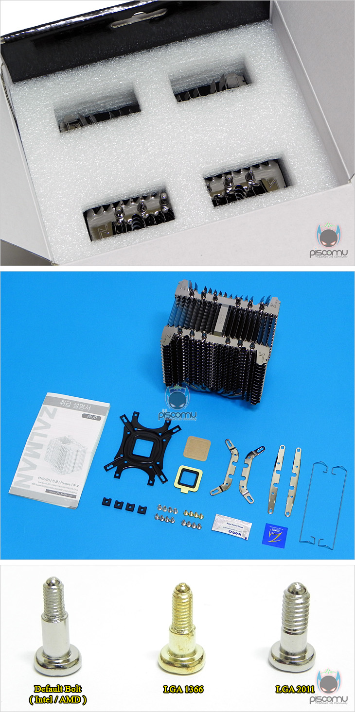 제품 포장은 쿨러 경우 박스 내부에서 흔들이지 않게 그리고 외부 충격 흡수 파손 방지를 위해 우레탄 폼을 사용했으며, 쿨러를 비롯한 제품 구성에는 설명서, 인텔/AMD 백플레이트, 양면테이프, 로딩블록, 인텔용 클립, AMD용 클립, 팬 클립, 사이드 캡, 너트, 볼트, 써멀컴파운드로 이루어져 있습니다. 볼트 경우 소켓에 따라 구분이 되기 때문에 장착 시 용도에 맞는 볼트를 사용하면 되겠습니다.