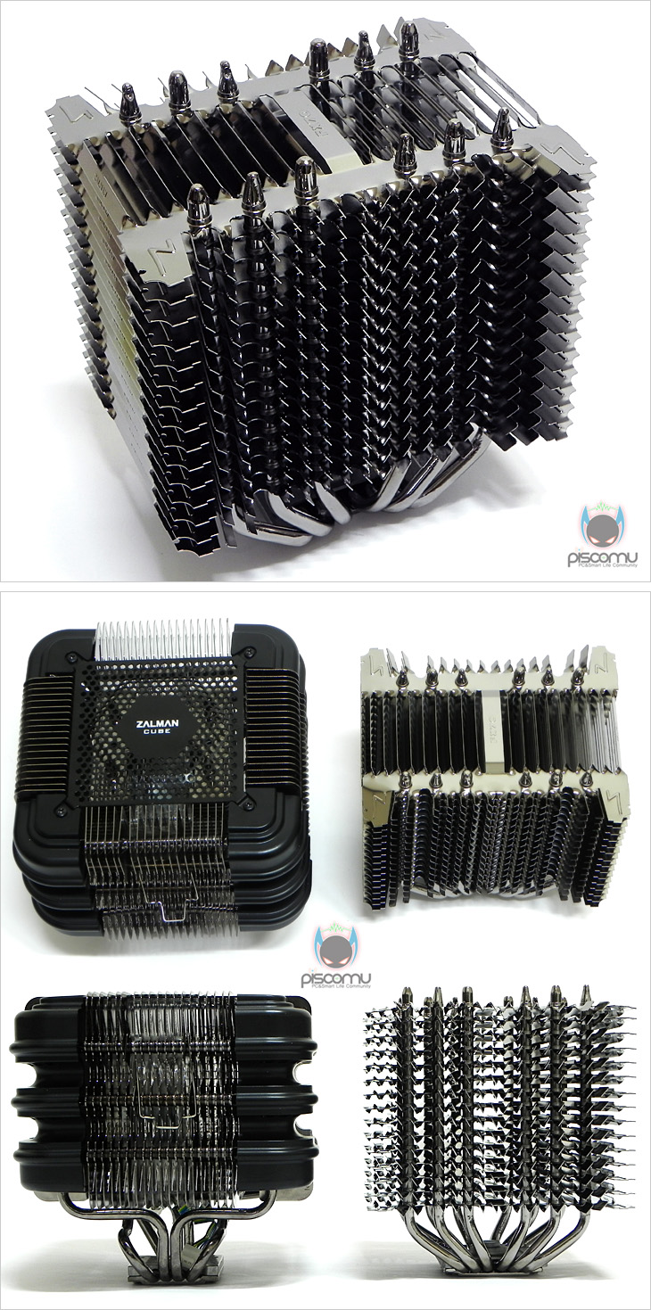 FX70을 살펴보면, 쿨러 전체는 그 동안의 제조사 제품들과 마찬가지로 잘만 특유의 흑진주 니켈 도금이 이번에도 적용되어 고급스러운 느낌을 줍니다. 그리고, 이전 FX100모델과 비교했을 시, 높이와 폭은 비슷하며, 깊이 길이가 줄어들었습니다. 전반적으로 외형적인 생김새가 일반 타워형 쿨러와 비슷합니다.