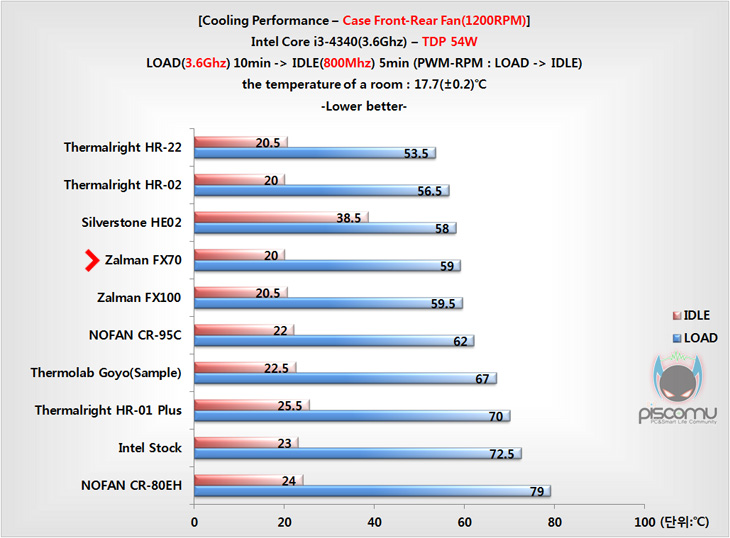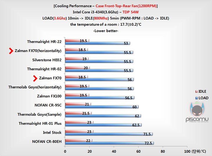 이번엔, 실제 사용환경처럼 케이스 내부에 장착한 상태에서 냉각 성능을 확인해보는데, 현재 국내 케이스 트랜드를 고려해, 상단, 후면, 전면 모두 120mm 팬을 장착하고, 일부 케이스에 상단 팬은 옵션으로 미제공 되는 경우가 있어, 전면과 후면 팬만 작동했을 시, 그리고 상단 팬까지 모두 작동했을 시 2가지 경우로 진행됩니다. 팬 속도는 모두 동일하게 1200RPM대로 설정합니다. 그리고, FX70 경우 앞서 간섭부분에서 수평 경우 간섭이 더 없는 경우이기 때문에 기본 수직 방향과 더불어 수평 방향에서도 진행을 했습니다. 단, 수평 방향은 상단 팬까지 작동했을 시 진행입니다. 먼저, 전면과 후면 팬만 작동된 상황에서 FX70의 냉각 성능을 확인해보면, LOAD시 비교모델들 중 4번째로 낮은 온도로 상위 수준임을 확인할 수 있습니다. 특히, 이전 FX100과 비슷한 성능을 보여, 크기과 TDP가 줄어들었다라는 점까지 고려하면 더 좋은 결과라 할 수 있고, IDLE로 돌아가는 온도 전환에서는 비교 모델들 중 가장 낮은 온도에 속해, 신속한 열 배출이 이루어진다 할 수 있어, 이번 모델의 특징인 트위스트 히트싱크의 효과가 좋다라고 할 수 있습니다.