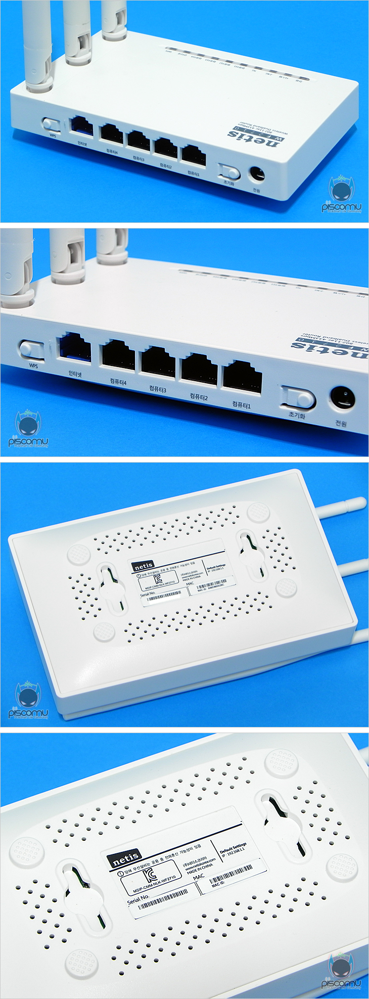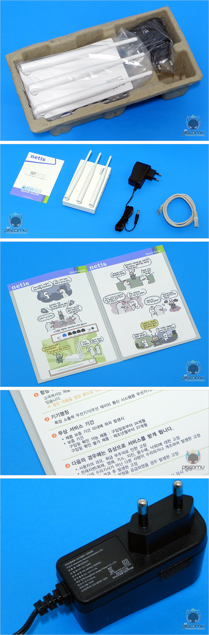 제품 박스부터 살펴보면, 제조사명을 시작으로 제품 이미지가 삽입되어 있어, 구입 전 제품 형태를 간접적으로 확인할 수 있습니다. 그리고, 모델명을 비롯한 제품 특징에는 802.11ac 규격 지원, 듀얼 밴드 지원, 3개의 안테나 지원, 스마트(모바일) 호환, 보완 강화를 특징으로 언급하고 있습니다. 박스 측면에는 국내 본부인 ㈜네티스코리아와 모바일 접속을 위한 QR코드가 삽입되어 있으며, 박스 후면에는 해당 제품의 기본 스펙 정보를 확인할 수 있는데, CPU, RAM부터 주파수, 크기, 무게, 제품 구성 목록까지 상세히 기재되어 있습니다. 제품 포장은 속박스 적용과 함께 부품별로 비닐 포장식으로 깔끔하게 되어 있으며, 제품 구성은 설명서, 공유기, 전원어댑터, 랜 케이블로 필요한 기본 요소를 갖추고 있습니다. 그리고, 경쟁사와 차별화로 설명서는 딱딱한 문구식의 설명 대신 만화 형식으로 설명을 하고 있어, 공유기 사용자 초보자도 이해를 쉽게 할 수 있도록 했습니다. 또한, 제품 보증 기간이 눈에 띄는데, 일반적으로 무상 보증 기간이라면 구입 및 제조년일 상관없이 동일하게 적용된다. 즉, 다시 말해, 구입 날짜를 모르면 제조년일로 적용하기 때문에 일반적으로 보증 기간이 줄어드는 입장이 됩니다. 하지만, 네티스는 이런 소비자들의 관리 부실 발생에 따른 보증 기간까지 고려해, 구입 날짜 확인이 어려운 경우 제조년일로 보증 적용시 기간을 좀 더 길게 적용하고 있습니다. 이런 부분은 전자제품 통틀어 드문 방식이지만, 소비자 입장에선 아주 좋은 입장이기 때문에 구입에 또다른 매력이라 할 수 있습니다. 그리고, 전원어댑터는 국내 판매를 위해 전기용품안전인증(KC)을 받았습니다.