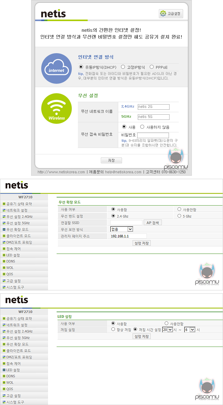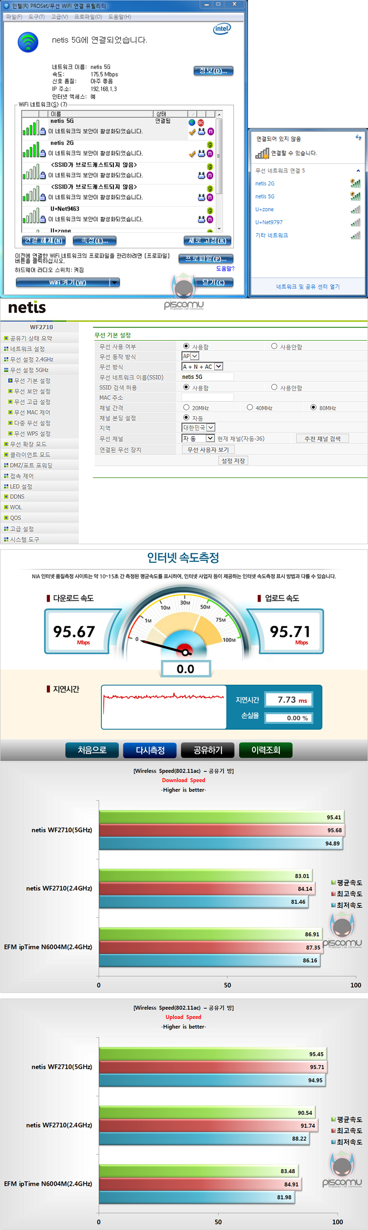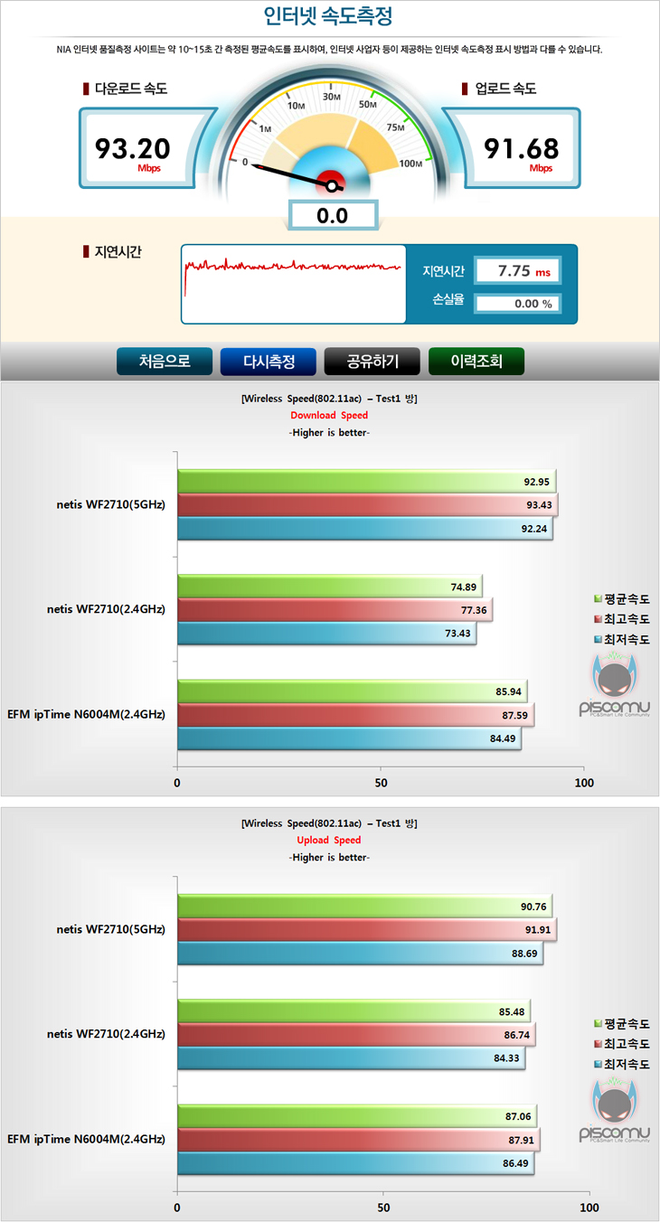 직접, WF2710을 사용해보겠습니다. 일단, 다른 유무선공유기와 마찬가지로 WF2710 역시 인터넷 랜 케이블만 연결되면, 인터넷 연결이 자동으로 이루어집니다. 또한, 작동 램프를 통해 실시간 연결된 인터넷 연결 상황을 확인할 수 있습니다. 일단, 기본적으로 유선 속도의 경우 앞서 스펙에서 확인했듯이 100Mbps를 지원하고 있는데, 측정결과, 오차 범위에 근접한 결과를 보여주고 있음을 확인할 수 있습니다. 사실상 인터넷 유선망은 현재 100Mbps 평준화이기 때문에 공유기 유선 성능에 큰 차이가 없습니다. 따라서, 이제부터인 무선 인터넷의 성능이 중점이라 할 수 있는데, WF2710과 비교할 모델은 안테나 2개의 현재 기본적으로 사용되는 802.11n까지 규격을 까진 모델로 속도 측정은 공유기가 있는 방에서 무선 속도, 바로 옆 방의 무선 속도, 그리고 거리상 가장 먼 방에서의 무선 속도로 각각 측정하는데, 문을 닫았을 때의 속도 차이로 측정은 각 방에서 상황에 맞춰 3번씩 측정해 평균 속도, 최대 속도, 최저 속도를 산출했습니다. 속도 측정은 한국정보진흥원(http://speed.nia.or.kr/) 홈페이지에서 했으며, 환경에 따라 속도차이가 있음을 참고하시기 바랍니다. 먼저, 현재 기본적으로 많이 사용되는 2.4GHz 주파수의 최고 속도 규격인 802.11n 규격으로 공유기가 위치한 방에서 무선 속도를 확인해 본 결과, 다운로드는 비교모델보다 조금 낮지만, 업로드 속도가 많이 높은 것을 확인할 수 있습니다. 그리고, 공유기 설정의 무선 설저 2.4GHz 항목을 통해 규격이 802.11 b/g/n까지 연결 지원되는 것을 확인할 수 있습니다. 즉, a방식은 5GHz 주파수에서 연결 지원되는 것을 짐작할 수 있습니다. 이번엔 WF2710에서 지원되는 5GHz 주파수의 802.11ac 규격으로 연결한 무선 속도를 확인한 결과, 앞서 802.11n 규격 속도보다 높게 유선 속도에 근접하는 속도를 보여주는 것을 확인할 수 있습니다. 즉, 2.4GHz 주파수는 신호 거리는 멀지만, 속도가 5GHz 보다 낮고, 5GHz 주파수는 신호 거리는 짧지만, 속도가 높다라는 점에서 속도부분에 대한 성능을 그대로 보여준다 할 수 있습니다. 또한, 바로 앞에서 말했듯이, 802.11a 규격이 5GHz 주파수에 속한 것을 확인할 수 있고, 802.11n이 공동으로 사용된다라는 것도 확인할 수 있겠습니다. 이번엔 공유기 바로 옆 방에서 2.4GHz 주파수 802.11n 규격과 5GHz 주파수 802.11ac 규격에서 각각 연결해 속도 비교를 해 본 결과, 2.4GHz 주파수 802.11n에서 비교모델과 WF2710 모두 공유기 방에서 보다 속도가 낮아진 것을 확인할 수 있는데, WF2710의 다운로드 속도가 비교모델에 비해 더 낮아진 것을 확인할 수 있으며, 업로드 속도는 낮아졌지만, 다운로드 속도보다 높은 편임을 확인할 수 있습니다. 이에 반해, 5GHz 주파수 802.11ac 규격에선 공유기 방에서의 속도보다 조금 낮아졌지만, 여전히 90Mbps대로 다운로드와 업로드 속도 모두 높은 것을 확인할 수 있습니다. 즉, 5GHz 주파수 거리가 방 한 칸 정도까지는 어느 정도 속도에 큰 영향을 주지 않는 것을 알 수 있습니다. 속도 성능 끝으로, 공유기에서 가장 먼 방에서 역시 각 주파수 별로 속도 측정을 해보았는데, 먼저 2.4GHz 주파수 802.11n 규격 속도에선 WF2710이 다운로드 속도에서 급격히 떨어지는 속도를 보여줬습니다. 반면에 업로드 속도는 떨어졌지만, 다운로드 속도보다는 높게 유지되는 것을 확인할 수 있습니다. 즉, 지금까지의 2.4GHz 주파수대 802.11n의 WF2710은 다운로드보다 업로드 속도가 높게 나온다라는 것을 알 수 있습니다. 그리고, 5GHz 주파수대의 802.11ac 경우엔 거의 한 자리 수대 속도로 나오는 것을 확인할 수 있어, 앞서 말한 5GHz 주파수의 신호 거리가 짧다라는 점을 그대로 반영해 보여준다 할 수 있습니다. 끝으로, WF2710의 공유기 설정 메뉴에 대해 잠깐 언급하자면, 모두 한글 지원으로 사용자가 쉽게 이해하고 설정할 수 있는데, 특히, 메인 화면은 간단하게 무선 접속 비밀번호를 설정할 수 있게 해주고 있으며, 유무선 공유기 2대 이상 사용시 무선 Wi-Fi 망을 확장할 수 있는 모드와 공유기에 작동되는 연결 상태 확인의 LED 램프를 사용자가 원하는 시간대에 끄게 할 수 있는 설정이 있어 눈에 띕니다.