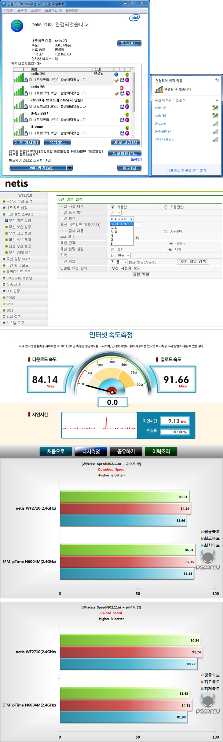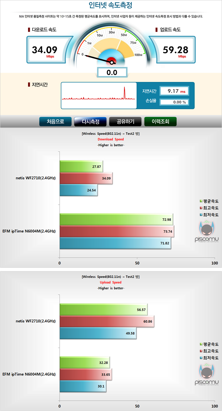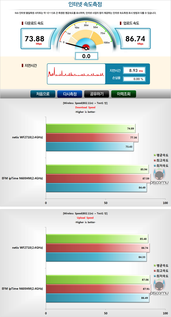 올해부터 본격화 되는 차세대 Wi-Fi인 802.11ac와 5GHz 주파수를 추가로 가져 듀얼 밴드를 갖춘 네티스의 유무선공유기 WF2710은 가격에서 제품 매리트를 찾을 수 있습니다. 현재 802.11ac 규격과 2.4/5GHz 주파수 듀얼 밴드를 갖춘 유무선 공유기 중 2만원대로 가장 저렴한 모델이기 때문입니다. 내부를 확인할 수 없지만, 스펙상 리얼텍 520MHz CPU와 DDR2 64MB 메모리를 갖추고 있어, 동급 모델에 비해 분명 가격이 저렴한 편이라 할 수 있습니다. 속도에서도 유선 속도는 기본적으로 충족시켜주며, 무선의 경우 방 한 칸 정도를 두고는 802.11ac의 속도가 상당히 높게 잘 나온다라는 점에서 공유기 근접 거리에서의 무선 성능은 만족스럽다 할 수 있습니다. 하지만, 전반적으로 조금 낮게 나오는 2.4GHz의 다운로드 속도와 무선 신호 범위가 넓지 않은 점은 속도면에서 볼 때 아쉽다 할 수 있습니다. 하지만, 역시 이런 아쉬움은 일반적으로 유무선 공유기는 가격에 성능이 비례하기 때문에, 제품 가격이 2만원대라는 점에서 충분히 이해가 될 수 있는 부분이라 생각됩니다. 데스크탑 PC는 이미 802.11ac 지원을 하기 시작했고, 노트북과 스마트폰 역시 올해부터 802.11ac 지원 모델을 본격적으로 내놓을 예정이기 때문에, 소규모 사무일이나 원룸 같은 한 공간에서 유선뿐만 아니라 무선까지 빠른 속도의 무선 망을 갖추고 싶다면, 가격부담 없는 네티스 WF2710을 접해보길 바랍니다.