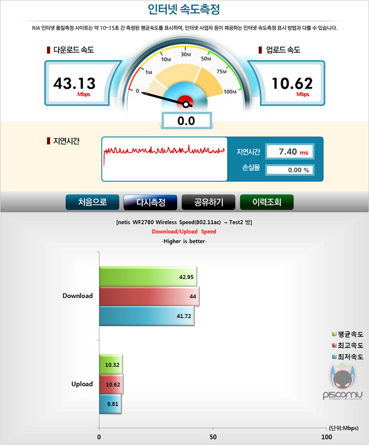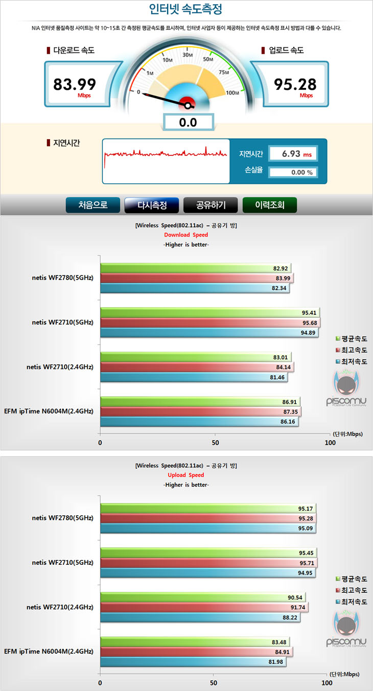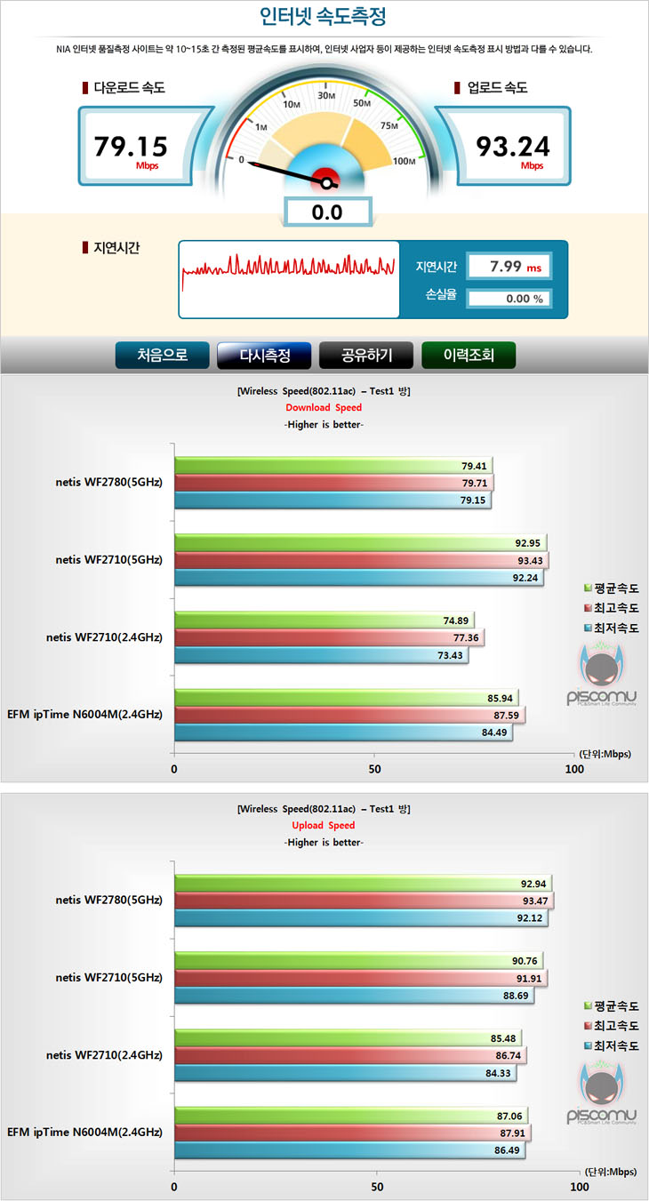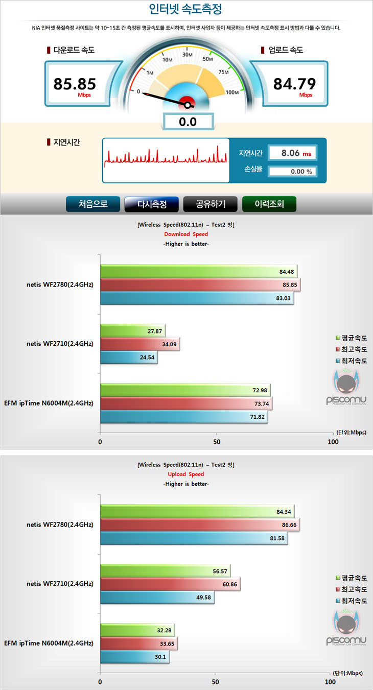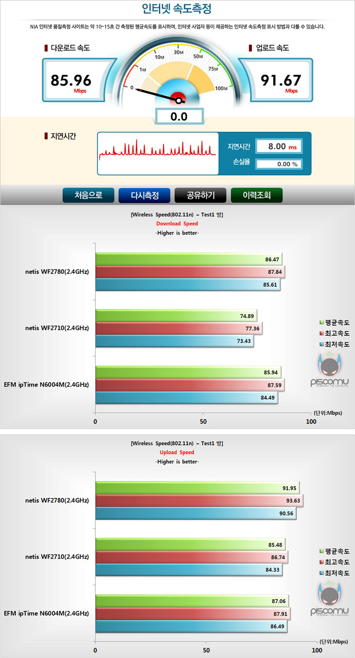 시작에서 말했듯이, 네티스의 듀얼-밴드 및 802.11ac 규격 지원 유무선 공유기 중 현재 가장 상위 모델인 WF2780은 앞서 만난 WF2710보다 확실히 우위의 모델임을 보여줍니다. 전체적인 내부 하드웨어 스펙과 추가된 5GHz 주파수 안테나까지 전반적으로 2.4/5GHz 모두 신호 범위가 넓어진 것을 확인할 수 있습니다. 역시 가격에 성능이 비례한다라는 점을 잘 보여준다 할 수 있습니다. 물론, 거리가 멀수록 속도가 떨어지는 현상은 있지만, WF2710에 비해 떨어지는 속도가 낮으며, 5GHz 802.11ac 역시 업로드 속도가 거리에서 멀어질 때, 급격히 떨어지는 점을 제외하면, WF2780이 가진 하드웨어 스펙상 역시 가격이 5만원 초반이라는 점에서 제품 매력을 느낄 수 있습니다. 작은 공간에 빠른 속도를 원한다면 WF2710을, 안정적이고 넓은 범위의 속도 유지를 원한다면 WF2780을 선택하는 것이 현명한 선택이라 할 수 있습니다. 두 제품 모두 가격면에서 매리트가 있기 때문에, 공유기 시장에서의 선전을 기대해봅니다.