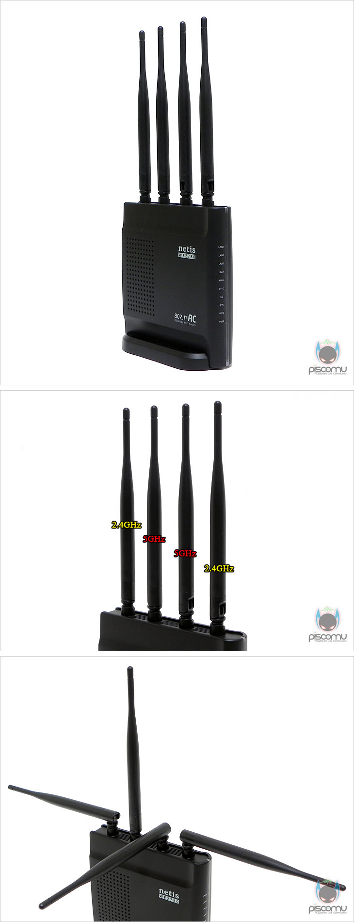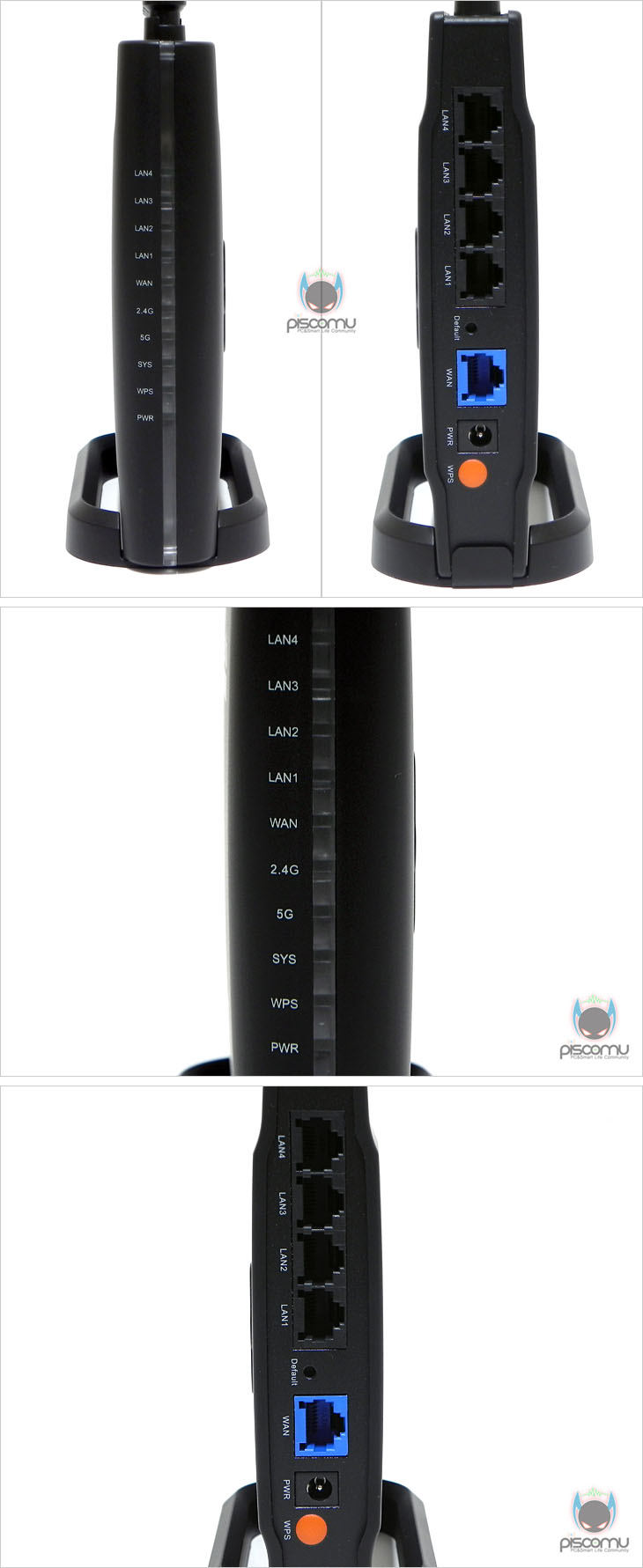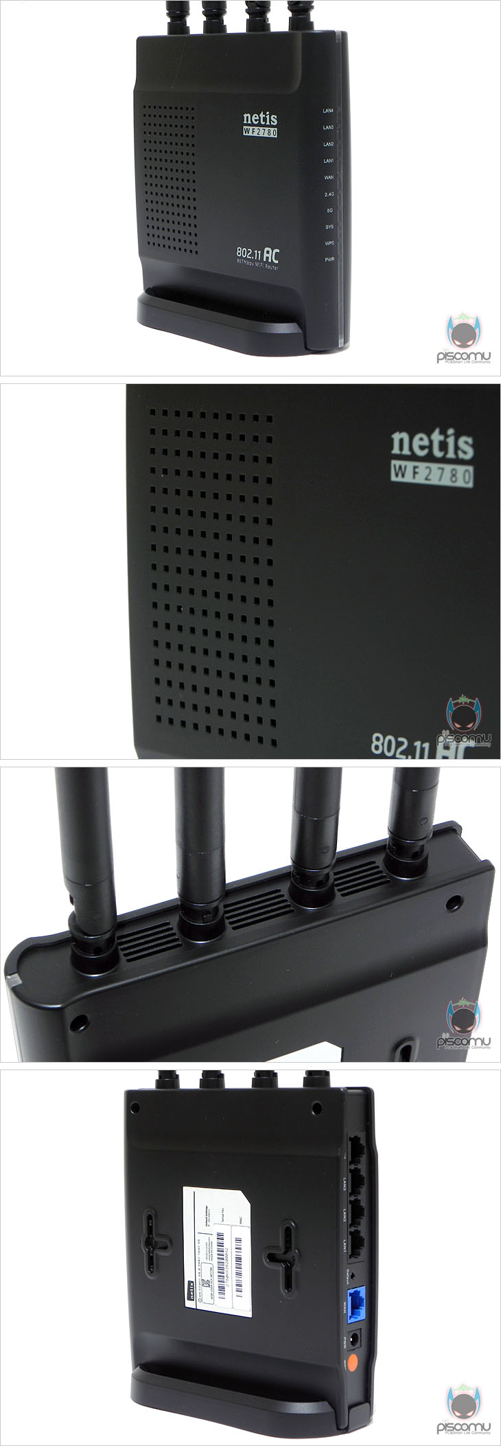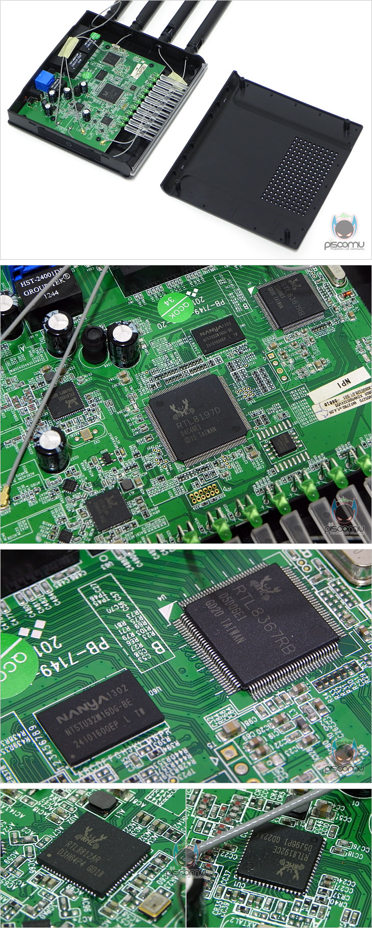 이제, WF2780을 살펴보겠습니다. 색상은 WF2710와 대비되는 블랙 색상을 가졌으며, 기본적으로 눕혀 사용하는 WF2710과 달리, WF2780은 크래들 제공으로 기본 세로로 세워서 사용하게 됩니다. 그리고, 안테나는 WF2710보다 1개 들어났는데, 바로 5GHz 주파수의 안테나가 추가로 늘어났습니다. 안테나 방향은 자유롭게 사용자가 조절할 수 있습니다. 신호세기는 5dBi로 WF2710과 동일합니다. 본체를 살펴보면, 측면에는 모델명과 함께 내부 발열을 배출할 수 있게 에어홀 처리가 되어 있으며, 추가로 상단 부분인 안테나 부분에도 에어홀 처리가 되어 있습니다. 그리고, 반대편 측면에는 벽걸이 사용을 위한 홈-처리가 되어 있습니다. 전면에는 작동 LED램프 위치로 위에서부터 랜 포트 4/3/2/1, 인터넷(WAN), 2.4GHz, 5GHz, 시스템(SYS), WPS, 전원(PWR) 순으로 배치되어 있습니다. 그리고, 후면에는 램프 배치와 동일한 순서로 랜 포트와 인터넷 포트, 초기화(Default), 전원, WPS 버튼이 배치되어 있습니다. 인터넷 WAN포트는 구분이 쉽도록 커넥터 색상을 블루로 처리했습니다. 끝으로, 본체의 내부를 잠깐 살펴보면, WF2780의 네트워크 메인칩셋은 리얼텍 RTL8197D로 CPU 역할을 하며 처리속도는 667MHz로 앞서 말했듯이 WF2710보다 빠릅니다. 또한, 스위치로 역시 리얼텍 RTL8367RB가 적용되어 있습니다. 그리고, DDR2 64MB(NT5TU32M16DG-BE) 메모리 사용과 802.11ac 지원의 5GHz 주파수 지원의 리얼텍 RTL8812AR 칩셋, 그리고 802.11n까지 지원되는 2.4GHz 주파수 역할의 리얼텍 RTL8192CE이 적용된 것을 확인할 수 있습니다.