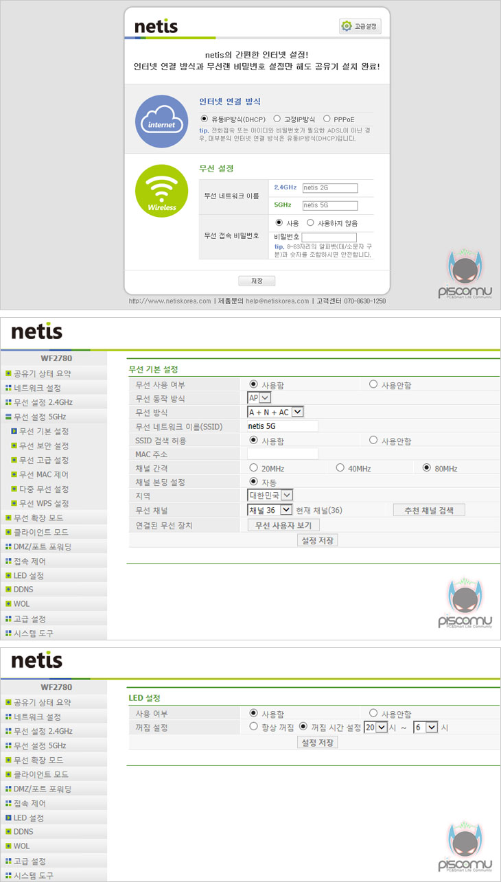 그럼, 이제부터 WF2780의 속도 성능을 확인해보겠습니다. 일단, 유선 속도 경우 최대 1000Mbps(기가비트)를 지원하지만, 아직 상용화가 되지 않았기 때문에, 현재 가장 많이 보급되는 100Mbps 지원을 확인으로 업로드/다운로드 속도 모두 100Mbps에 근접하는 속도를 보이는 것을 확인할 수 있습니다. 이번에 무선 속도를 확인해보는데, 듀얼밴드 및 802.11ac 규격을 지원하는 노트북을 통해 공유기가 있는 방, 공유기 바로 옆 방, 거리상 공유기에서 가장 먼 방까지 각 장소에서 3번씩 속도 측정을 해, 평균/최고/최저 속도를 산출했습니다. 속도 측정은 한국인터넷진흥원 사이트에서 측정했습니다. 먼저, 공유기가 있는 방에서 기본 무선 속도로 2.4GHz 주파수의 802.11n 규격으로 무선 속도를 측정한 결과, 다운로드와 업로드 속도 모두 앞서 만난 WF2710보다 좀 더 높은 속도를 보여줬습니다. 이번엔 공유기 있는 방에서 주파수 5GHz의 802.11ac 규격으로 무선 속도를 측정해보았는데, 측정 결과, 다운로드는 앞서 802.11n과 비슷한 수준, 업로드는 95Mbps대로 100Mbps에 근접한 결과를 보였습니다. WF2710과 비교하자면, 다운로드는 낮은 편이고, 업로드는 동급인 수준입니다. 이번에는 공유기와 거리를 두고 바로 옆 방에서 속도 측정을 해보는데, 먼저 2.4GHz 주파수의 802.11n 규격으로 측정한 결과, 공유기가 있던 방에서의 속도와 큰 차이가 없는 속도를 다운로드와 업로드에서 보여줬습니다. 앞서 만난 WF2710과 달리, 신호 범위가 넓어져 바로 옆 거리 방의 속도에 큰 영향을 주지 않는 것을 알 수 있습니다. 5GHz 주파수의 802.11ac 규격의 속도 경우에도 공유기 방에서보다 다운로드 속도가 줄었지만, 앞서 만난 WF2710에 비하면, 줄어든 속도가 작은 편임을 알 수 있습니다. 그리고, 업로드 속도는 거의 차이가 없는 상태임을 확인할 수 있어, 역시 WF2710에 비해 5GHz 주파수의 범위가 더 큰 것을 짐작할 수 있습니다. 끝으로, 공유기에서 가장 먼 방에서 무선 속도를 측정해보는데, 먼저 2.4GHz 주파수의 802.11n 규격에선 앞서 만난 WF2710과 달리 다운로드 속도가 급격히 떨어지지 않고, 공유기 바로 옆 방에서보다 약간 떨어지는 속도로 여전히 높은 속도를 유지하는 것을 확인할 수 있습니다. 또한, 업로드 속도 역시 WF2710에 비해 떨어진 속도가 낮은 편으로, 80Mbps대로 여전히 높은 속도를 유지합니다. 확실히, WF2710보다 2.4GHz 주파수의 신호 범위가 넓은 것을 확인할 수 있습니다. 5GHz 주파수의 802.11ac 규격 경우엔 앞서 WF2710은 급격히 속도가 저하되는 것을 확인할 수 있어, 5GHz의 단점인 짧은 신호 범위를 확인할 수 있었는데, WF2780의 5GHz 802.11ac은 앞에 속도보다 다운로드 속도가 많이 줄어들었지만, 40Mbps대를 유지하고 있어, 10Mbps도 나오지 않았던 WF2710보다는 확실히 5GHz의 주파수도 넓다라는 것을 확인할 수 있습니다. 반면에 업로드 속도는 급격히 줄어든 것을 확인할 수 있지만, WF2710보다는 약간 높은 속도입니다. 끝으로, WF2780의 공유기 설정을 살펴보면, 전체적인 메뉴는 WF2710와 동일한데, 메인 화면에는 역시 간단히 무선 비밀번호를 설정할 수 있게 지원해주고 있으며, 무선 5GHz 설정에서 80MHz 대역폭이 추가된 것을 확인할 수 있어, 수신 범위가 넓어진 것을 알 수 있습니다. 그리고, 역시 LED램프를 On/Off 할 수 있게 설정 지원해줍니다.