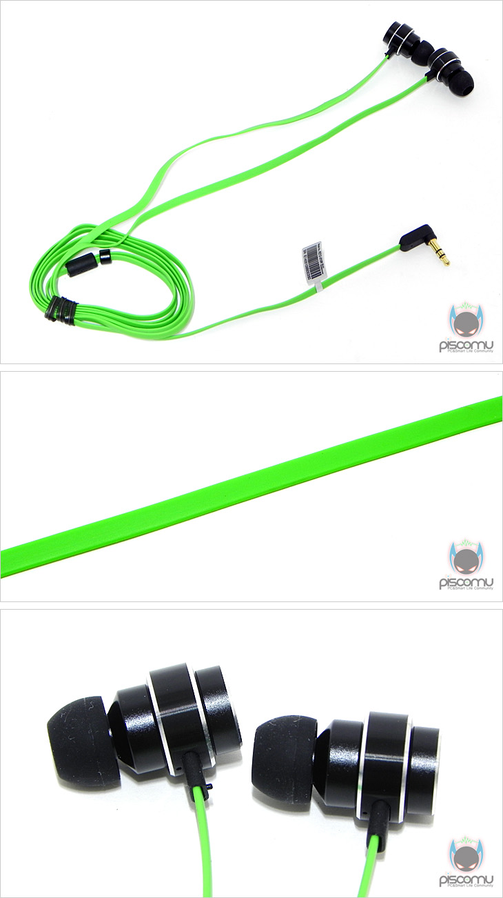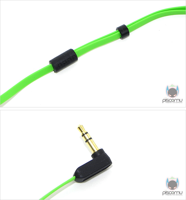 Adaro In-Ear를 살펴보겠습니다. 케이블 색상은 레이저 상징인 그린 색상을 가졌으며, 케이블 형태는 플랫(Flat) 형태로 선-꼬임 발생을 방지해 주겠습니다. 그리고, 케이블 길이는 1.3m가 되겠습니다. 헤드부분의 형태는 커널형이 되겠습니다. 헤드 바디는 앞서 제품 특징에도 언급되었듯, 알루미늄 재질을 사용해 고급스러운 느낌을 주며, 둥근 테두리 부분은 다이아몬드 컷팅으로 처리되었습니다. 그리고, 헤드 바깥 부분에는 제조사 로고가 새겨져 있으며, 내부 안쪽에는 사운드 필터가 적용되어 있습니다. 헤드 내부에는 스펙에서 확인했듯 10mm 크기의 드라이버 유닛이 적용되어 있습니다. 유닛 자석에는 네오디뮴이 사용되어 저음과 고음 처리를 보강해 좀 더 풍부하고 선명한 사운드를 느낄 수 있습니다. 그리고, 좌우로 케이블이 나뉘어지는 Y자 구분에는 케이블 벌어짐을 조절할 수 있는 홀더 장치가 적용되어 있습니다. 기기와 연결되는 단자(잭)부분은 금도금 처리로 신호손실을 최소화 하도록 했으며, 규격은 3.5mm 파이와 3극으로 최신 기기는 물론 구형 음향기기에서도 사용할 수 있겠습니다.