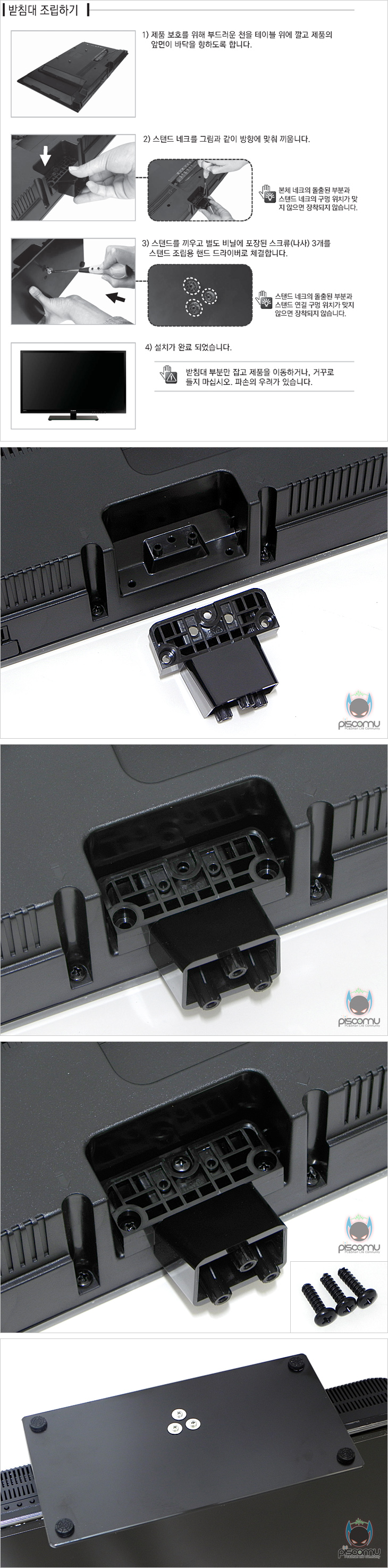 내부 포장 역시 비닐 포장과 함께 충격 방지를 위한 모서리 우레탄 폼 적용으로 처리가 되어 있으며, 스탠드를 제외한 부속품은 분실이 되지 않게 비닐 동봉 처리 되어 있습니다. 스탠드를 강화유리 재질이며, 모서리 부근에는 받침으로 고무 받침대를 적용했습니다. 부속품은 스탠드 네크, 스크류, 공구 드라이버, 동축 케이블, 리모컨 및 건전지가 제공됩니다.