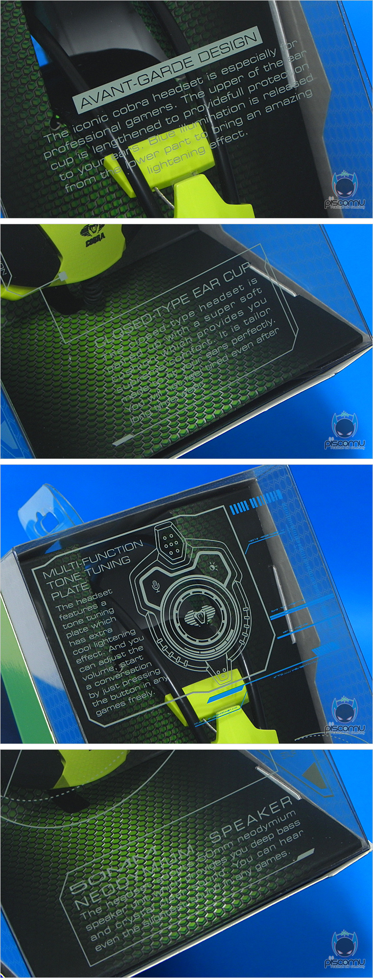 제품박스부터 살펴보면, 기존 모델과 달리 그린 모델은 내부에 포장된 제품 실물을 외부에서 확인할 수 있게 투명 케이스 처리되었습니다. 양쪽 이어-캡의 그린 색상 디자인을 미리 확인할 수 있습니다. 박스 전면에는 모델명과 컨셉 문구를 확인할 수 있으며, 제품 특징으로 디자인, 이어-캡, 50mm 네오디뮴, 튜닝 효과를 언급하고 있습니다. 기존 모델의 제품 특징과 동일하다라는 것을 알 수 있습니다. 각 측면에는 전면에서 언급한 제품 특징의 헤드라인 문구를 좀 더 세부적으로 부가 설명하고 있습니다. 박스 후면에는 제품의 기본 스펙 정보를 확인할 수 있으며, 아래는 내부 포장된 USB 포트의 마이크로 5핀 포트 실물을 확인할 수 있습니다. 라이트닝 이펙트라는 문구 확인으로 기존 기본 모델과 마찬가지로 USB로 LED 라이트닝 효과를 볼 수 있다라는 것을 알 수 있습니다.