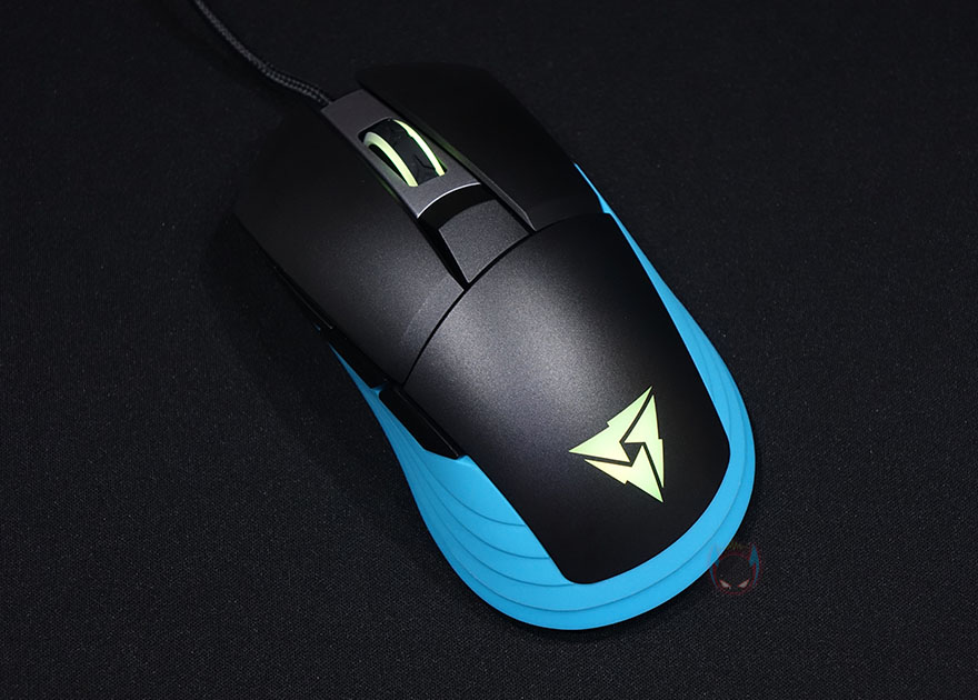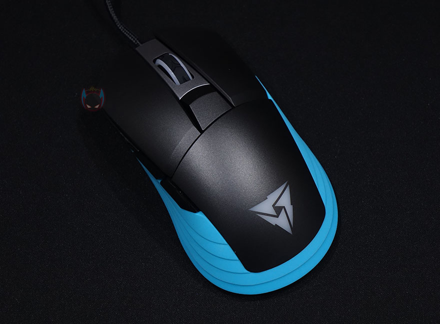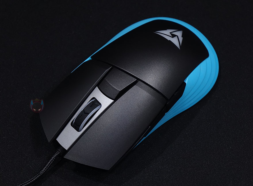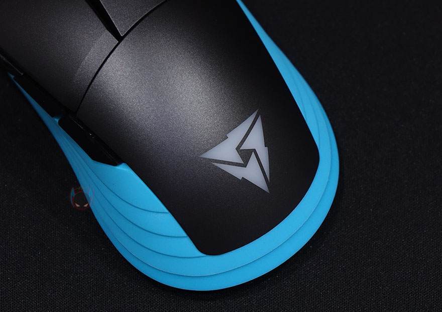 그리고, 기본 좌우버튼은 버튼 클릭 정확성을 위해 분리설계로 적용되었으며, 가운데 휠-버튼은 RGB 라이팅 효과를 볼 수 있는 디자인과 함께 휠-재질도 고무재질로 로고 문양까지 적용해 스크롤 접지력을 높이도록 했죠. 휠-버튼 뒤에는 DPI 단계조절 버튼으로 총 3단계로 조절할 수 있습니다. 손바닥과 맞닿는 팜-레스트 부분에는 ThunderX3 로고 표시를 역시 RGB 라이팅효과를 볼 수 있도록 해놨으며, 측면과 뒷부분의 그립 영역에는 블루 색상의 고무재질로 층층이 구분되는 쿠션 디자인을 적용했습니다.