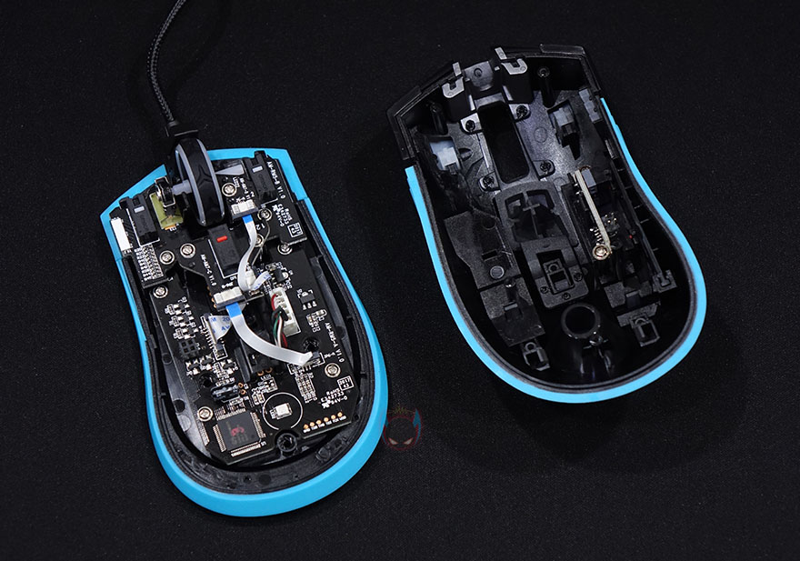 그리고, 마우스 밑바닥부분에는 앞쪽에 좌우 각각 나뉘어서 테프론-피트를 부착해놨고, 뒷쪽에는 라인을 따라 테프론-피트를 부착해놨습니다. 가운데는 센서부분으로 이미 언급했듯이 내부에 PixArt사의 PMW3325 센서가 적용되어 있죠. 케이블 길이는 총 1.8m에 꼬임방지를 위해 슬리빙처리를 해놨으며, 신호손실 최소화를 위해 노이즈 필터와 USB 인터페이스부분에 금-도금처리도 적용해놨습니다.