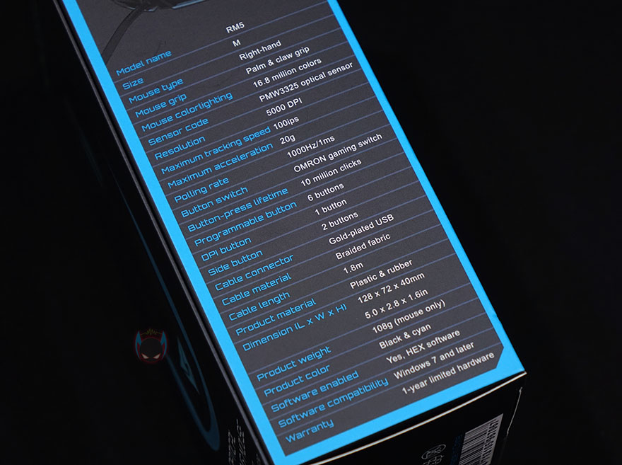 제품 팩키지는 다른 게이밍 마우스 제품들과 큰 차이가 없습니다. 전면에 제품 이미지를 당연히 담고 있어서 미리 확인할 수 있고, 모델명과 함께 주요 특징으로 RGB 라이팅, 옴론(OMRON) 스위치, 5,000DPI의 광-센서 표기를 확인할 수 있죠. 물론, 전면은 도어방식의 커버로 넘겨보면 내부에 포장된 RM5 마우스의 실물을 개봉하지 않고도 확인할 수 있습니다.