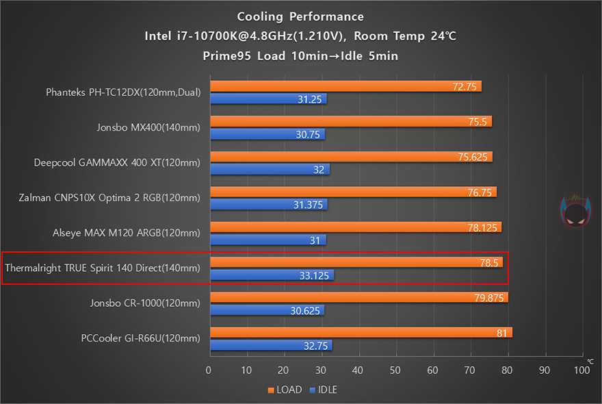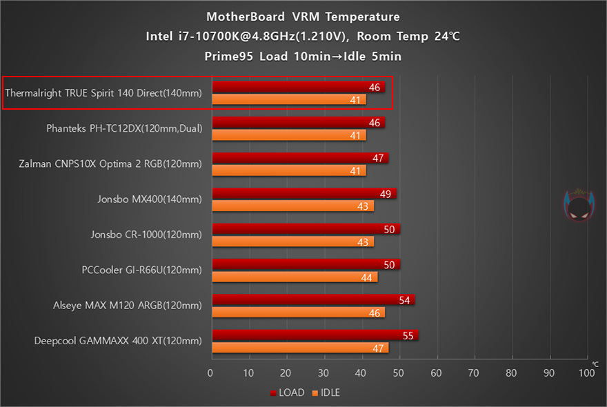 먼저, CPU온도를 확인해보면 Load 상황에서 약 78.5℃, Idle 상황에선 약 33℃인 결과를 보여줬는데, 비교 모델들 중에서는 조금 하위권 성능이지만, 메인보드의 전원부 온도를 확인해보면, 가장 낮은 온도를 보여주는 것을 확인할 수 있습니다. 이는 역시 140mm 팬의 영향이 크다라는 것을 그대로 보여준다 할 수 있죠. 기존의 TRUE Spirit 시리즈 제품들처럼 메인보드 전원부의 냉각효과 하나만큼은 탁월하다할 수 있습니다.