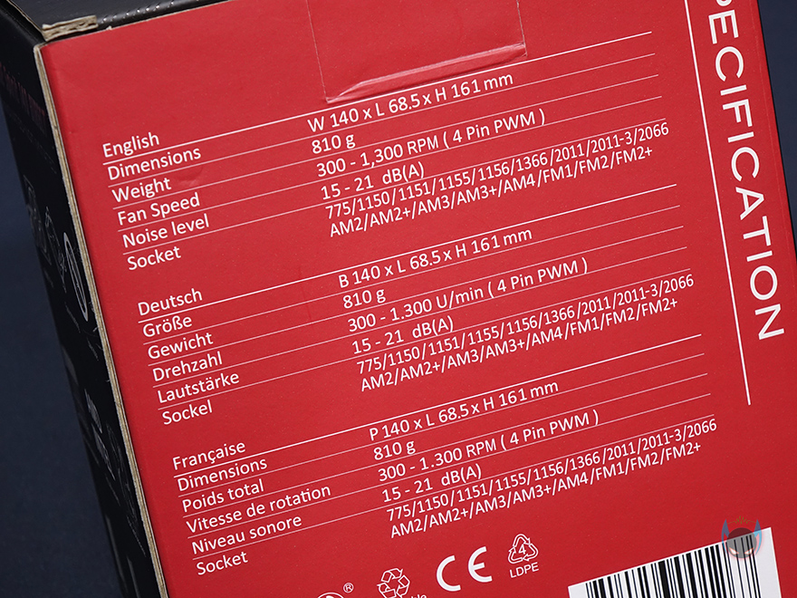 기본 제공되는 팬은 140mm 크기로 이미 여러 번 써멀라이트에서 봤던 TY-140과 유사한 디자인으로 팬 지름은 140mm지만, 장착 규격은 120mm를 가지고 있습니다. 팬 연결방식은 이미 박스 표기에서 확인한대로 PWM 방식이며, 팬속도는 300~1300RPM 범위를 가졌습니다. 그리고, 팬 장착은 제공되는 팬-클립을 사용해 장착하면 됩니다.