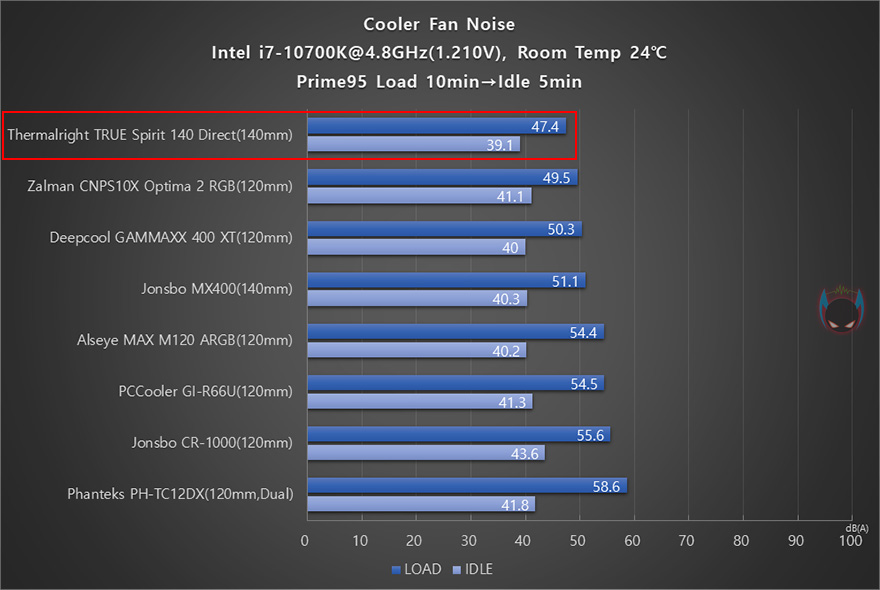 그럼, 이제 써멀라이트 TRUE Spirit 140 Direct CPU쿨러의 냉각성능을 확인해보는데, CPU는 인텔 i7-10700K이며, 전력해제를 했을 시에는 기본적으로 4.7GHz까지는 안정범위로 작동하기 때문에, 이보다 한계 높은 4.8GHz로 오버클럭을 적용해서, Prime95로 Load 10분 실행후, Idle 5분으로 돌아가는 상황으로 CPU온도와 메인보드 전원부 온도를 확인해봤습니다. 팬은 PWM 방식이기 때문에 메인보드에 바로 연결했으며, 소음측정을 위해 파워서플라이는 팬리스(Fanless) 제품으로 사용했습니다.