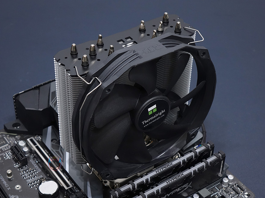 그럼, 이제 써멀라이트 TRUE Spirit 140 Direct CPU쿨러의 성능을 알아보기 전, 장착을 해보는데, 장착법은 기존의 써멀라이트 다른 쿨러 제품들과 유사한 방식으로 먼저 자신이 사용하는 CPU 소켓에 맞춰서 백플레이트와 필름을 와셔와 나사로 결합해줍니다. 그다음 결합된 백플레이트를 메인보드 소켓 쿨러-홀에 끼워주고, 너트로 고정을 해줍니다. 그리고나서, 그 위에 마운트를 올려주고, 다시 나사로 체결을 해주면 백플레이트와 메인보드 체결은 마무리가 됩니다. 그리고, 마지막으로 쿨러를 올려서 나사로 체결해주고, 마무리도 팬까지 장착해주면 장착 마무리가 됩니다. 장착 후, 메모리 슬롯과의 간섭여부를 확인해보면, 이미 언급한대로 팬을 장착하고도 슬림한 폭을 자랑하기 때문에 메모리 1번 슬롯과도 간섭이 없는 것을 확인할 수 있습니다.