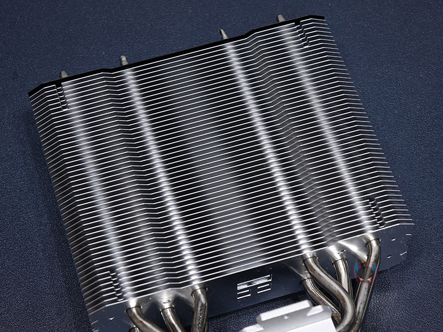 그럼, TRUE Spirit 140 Direct 쿨러부터 살펴보면, 쿨러 높이는 161mm, TRUE Spirit 시리즈답게 폭은 42mm로 슬림합니다. 참고로 팬을 장착했을 때 폭도 68.5mm 밖에 되지 않기때문에 사실상 메모리 슬롯과의 간섭은 없다라는 것을 미리 짐작할 수 있죠. 방열핀은 총 48개 구성으로 맨 상위 방열핀은 블랙색상으로 처리를 해놨으며, 가운데는 로고형태로 홀 처리를 해놨습니다. 그리고, 양쪽으로는 뒤에서 확인하겠지만, 팬 장착시 사용되는 팬 클립이 끼워지도록 홀 처리도 되어있죠. 히트파이프는 이미 주요 특징 표기에서 확인했듯이 지름 6mm 히트파이프로 총 5개가 적용되었으며, 방열핀과의 연결방식은 관통식입니다. 그리고, 히트파이프는 도금처리가 되어있으며 CPU와 맞닿는 DTH(Direct Touch Heatpipe)방식 베이스로 처리되어 있습니다.