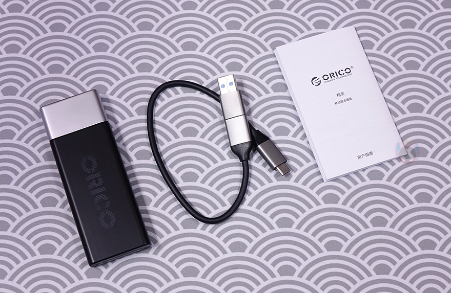 그리고, 앞서 제품 박스에서 확인했듯이 이 제품에 RGB 라이트효과(Light effect)가 적용된 부분은 블랙색상에 ORICO 로고(logo) 부분으로 픽셀(pixel) 형식으로 로고를 새겨놨습니다. 그리고, 실버색상 부분의 측면에는 제공되는 USB 케이블과 연결되는 USB Type-C 포트가 배치되어 있는데, 옆에 10이라는 숫자를 함께 표기해 10 Gbps 지원의 USB 3.2 Gen2 규격이라는 걸 짐작할 수 있습니다. 끝으로, 제공되는 USB 케이블은 30cm 길이에 한쪽은 USB Type-C와 A가 결합된 젠더방식으로 호환성을 높였습니다.