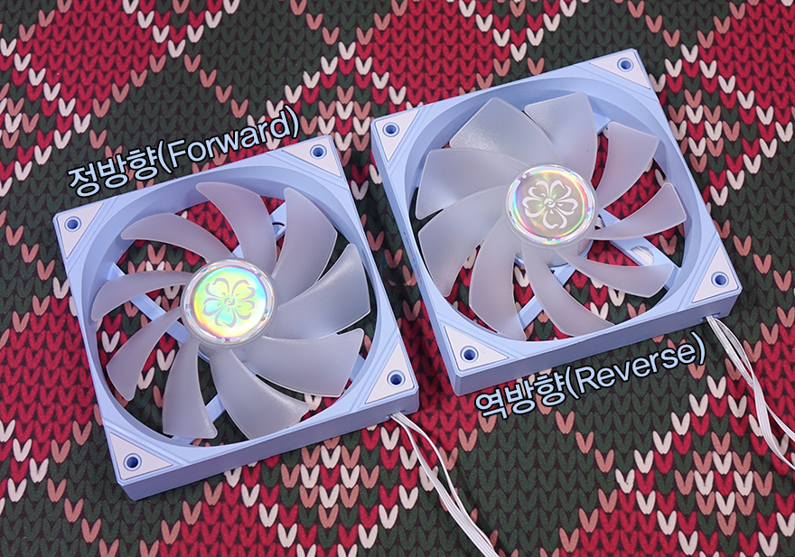 YESTON 사쿠라 역방향 팬(SAKURA Reverse Fan)을 살펴보면, 디자인은 정방향 팬(Forward Fan)과 동일합니다. 시작에서 언급했듯이 역방향 제품이라 단지 날개(Blade)만 다를뿐이죠. 실제로 정방향과 역방향 제품을 함께 놓고 보면 쉽게 이해가 됩니다. 같은 방향을 가지면서 날개 방향만 서로 다르죠. 그리고, 역방향 제품도 날개 중앙부분에는 사쿠라 문양을 홀로그램식으로 적용해 놨습니다. 참고로, 팬 날개도 총 9개로 동일하죠.