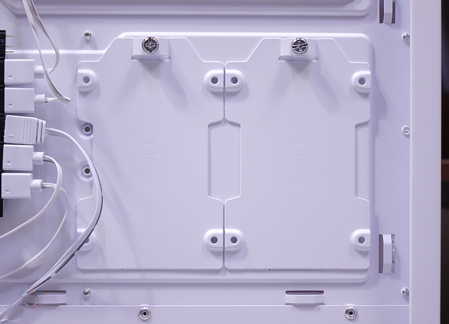 메인보드 트레이 후면 CPU-cut-Out 바로 아래에는 2.5인치 HDD/SSD를 장착할 수 있는 2개의 브래킷이 장착되어 있으며, 손나사 고정으로 나사를 풀면 쉽게 분리가 됩니다. 참고로 브래킷에 2.5인치 HDD/SSD 장착은 나사 방식이고, 하단 맨 아래 파워서플라이 자리에는 기본 받침대외에 길게 패드까지 기본 부착된 것을 확인할 수 있습니다. 그리고, 상단에 배치된 버튼 및 포트 케이블들 색상 역시 케이스 색상에 맞춰 화이트색으로 통일했습니다. 끝으로, C3 ARGB PC케이스에 사용된 새시의 두께를 부위별로 측정해 보면 전반적으로 0.7mm대인 것을 확인할 수 있습니다.
