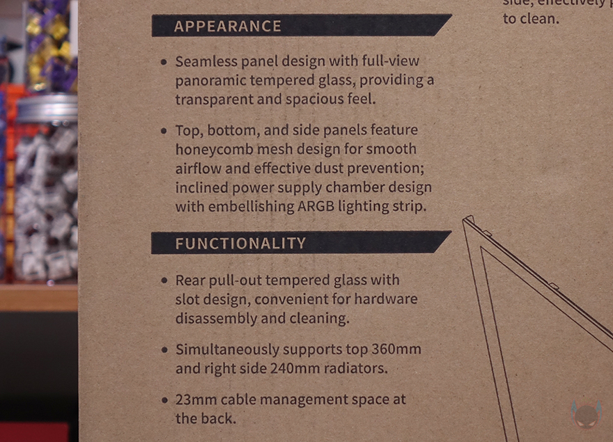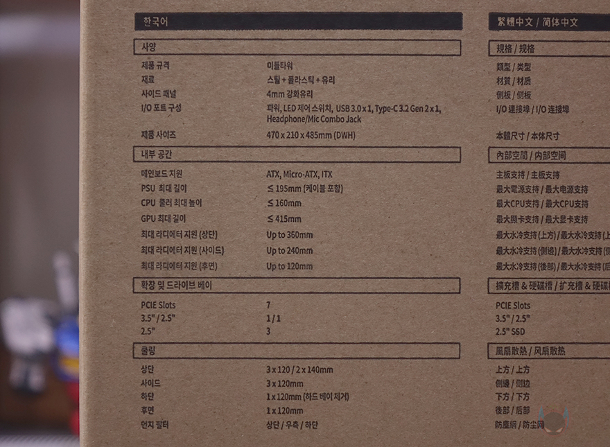 제품 박스부터 살펴보면, 전면에는 제품 풀샷 이미지와 함께 모델명을 확인할 수 있으며, 후면에는 안텍의 다른 PC케이스들처럼 제품 소개 문구를 담고 있습니다. 그리고, 바로 아래에는 제품의 주요 특징을 표기해놨는데, 기본 팬 제공을 비롯해 HDD 베이, USB 포트, 먼지 필터, 강화유리, 수랭쿨러 라디에이터 언급을 하고 있습니다. 바로 옆에 구조 이미지를 더해서 좀 더 쉽게 이해할 수 있죠. 또한, 박스 측면에 한국어를 포함해 다국적 언어로 제품의 기본 사양표기를 상세하게 하고 있어서 오프라인에서 구입할 때도 충분히 제품 정보를 얻을 수 있겠습니다.