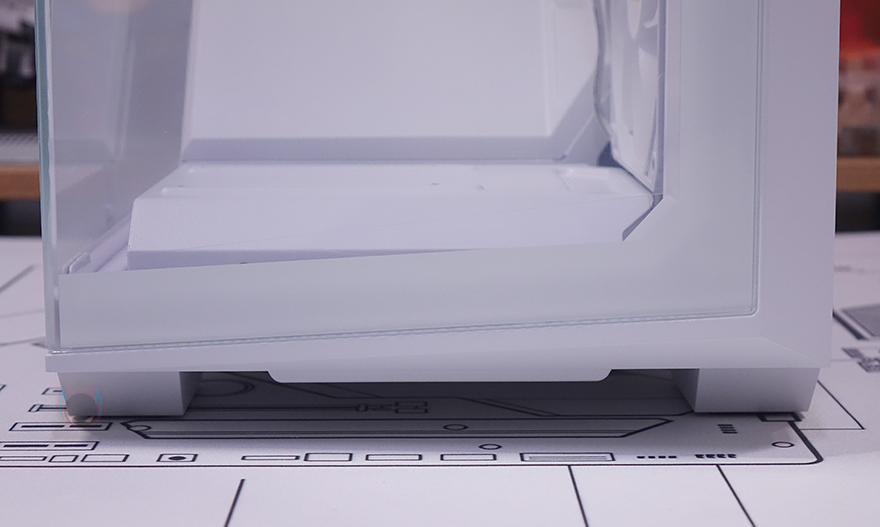 내부 하단에는 파워서플라이 챔버 즉 하단 커버를 적용하고 있는데, 일반적인 직각 디자인이 아닌 사선으로 디자인 처리를 했습니다. 그리고, 사선 부분에는 내부 후면에서 확인하겠지만, RGB 라이트 효과를 볼 수 있게 바(Bar) 디자인을 적용하고 있죠. 또한, 하단 전체 챔버를 적용한 게 아니라 내부 앞자리에는 앞서 외형에서 잠깐 언급한 HDD 베이가 배치되어 있습니다. HDD 베이는 외형 밑바닥에서 확인한 고정 나사 2개를 풀고, 앞으로 밀면 쉽게 분리가 되죠. HDD 베이에는 3.5인치 HDD를 장착할 수 있는 가이드가 1개 적용되어 있으며, 가이드는 2.5인치 HDD/SSD도 장착할 수 있게 겸용으로 지원합니다. 그리고, HDD베이 외부 상단에는 추가로 2.5인치 HDD/SSD를 장착할 수 있고, 만약 HDD베이를 사용하지 않는다면, 베이가 있던 자리에는 추가로 하단 쿨링시스템으로 120mm 팬을 장착할 수 있죠.