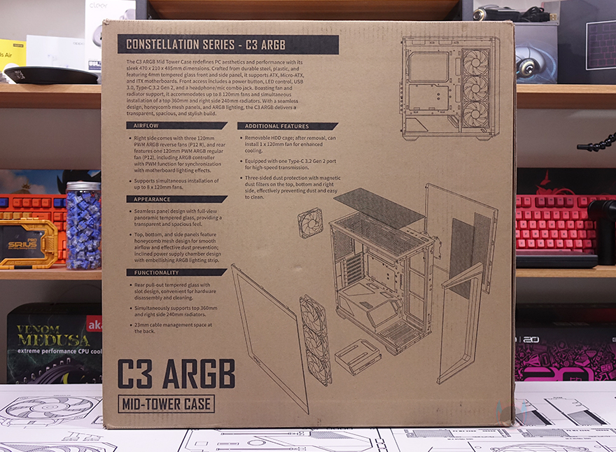 C3 ARGB PC케이스 포장은 비닐 포장과 함께 일반 스티로폼 포장재 대신 좀 더 완충효과가 좋은 우레탄-폼을 사용했으며, 케이스를 제외한 나머지 구성품들은 별도의 박스 포장으로 처리되어 있습니다. 구성품에는 제품 설명서, 소량의 케이블 타이, 부품 장착에 필요한 각 종 나사 제공으로 이루어져 있습니다.