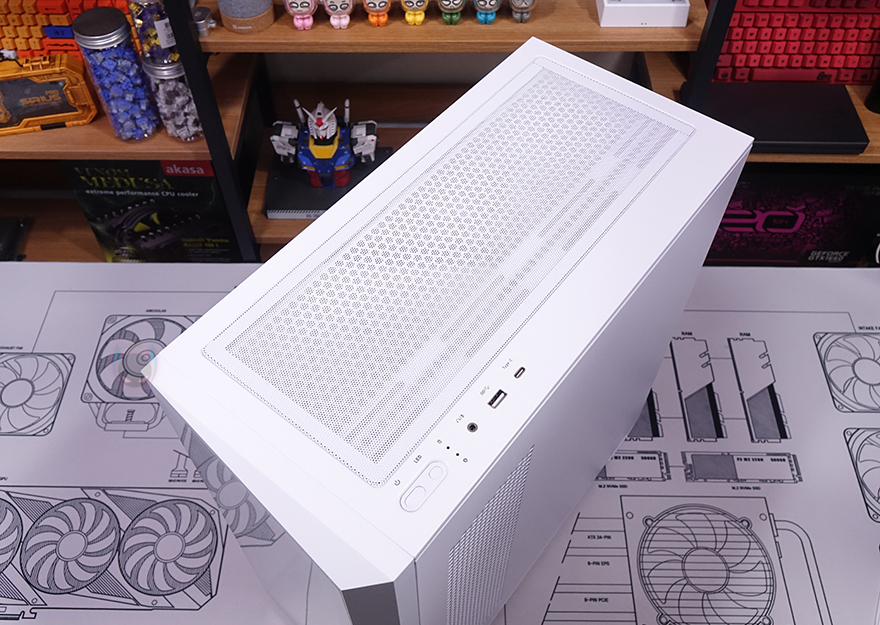 케이스 상단 같은 경우에는 맨 오른쪽 앞자리에 버튼 및 포트가 배치되어 있는데, 전원버튼, LED 버튼, 오디오/마이크 포트, USB 3.0 포트, USB 타입 C 포트순으로 적용되어 있습니다. 그리고, 상단 나머지 영역은 자석방식의 먼지 필터가 장착되어 있으며, 필터를 분리하면 상단 쿨링효과 및 쿨링시스템을 갖출 수 있게 벌집 모양의 에어홀과 나사홀이 처리된 것을 확인할 수 있죠. 상단 쿨링시스템 지원으로는 팬 경우 140mm 2개 또는 120mm 3개까지 장착할 수 있으며, 수랭쿨러시 라디에이터는 최대 360mm까지 장착할 수 있습니다.