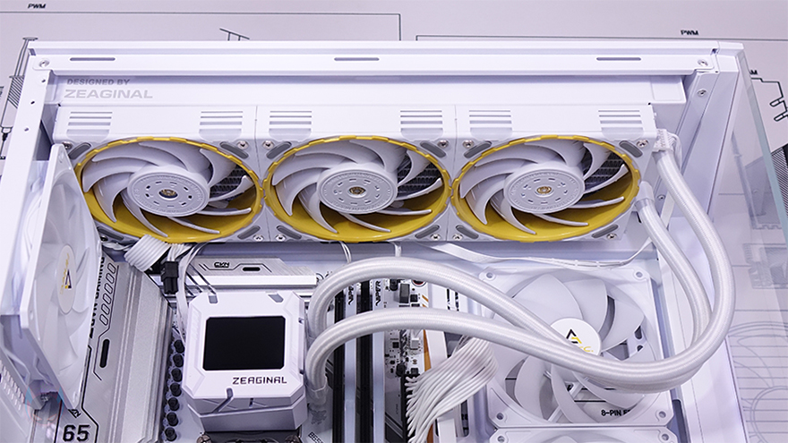 메인보드 트레이 뒷면인 내부 후면을 살펴보면, 기본 장착된 팬들을 컨트롤할 수 있게 허브 장치가 기본제공되는 것을 확인할 수 있습니다. 허브에는 4 pin PWM과 3pin ARGB 헤더 각각 6개씩 갖추고 있는데, 앞서 언급했듯이 기본 제공되는 120mm 팬 모두 4pin PWM 작동방식에 ARGB 팬이라 허브에 모두 연결된 상태입니다. 또한, ARGB 헤더 쪽에는 케이블이 하나 더 연결되어 있는데, 바로 챔버 쪽에 적용된 RGB 라이트바 케이블이죠. 그리고, 후면에서 측면 쿨링시스템을 보면 앞서 언급했듯이 120mm 팬 외에 수랭쿨러시 라디에이터를 장착할 수 있게 나사홀을 길게 처리해 놨습니다.