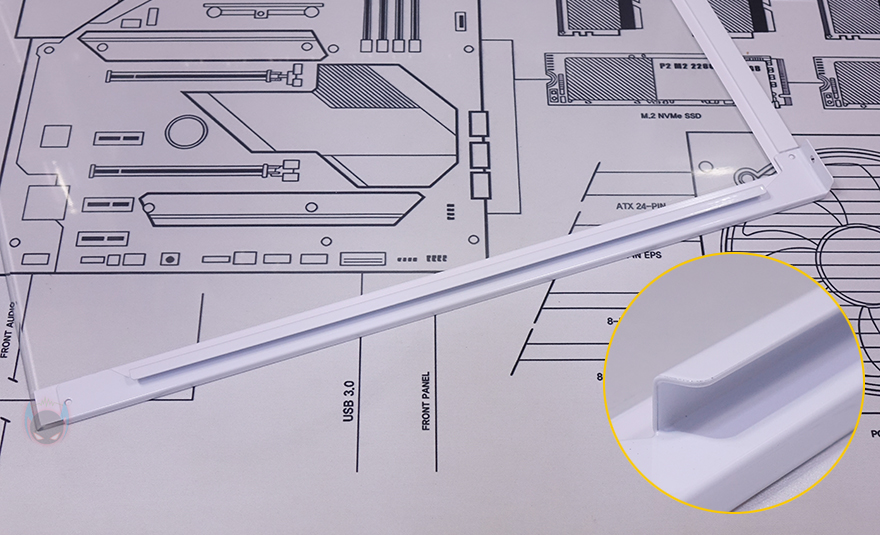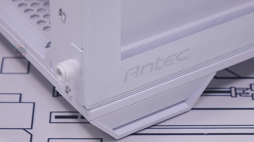 전면에서 이어지는 측면 강화유리는 왼쪽 사이드 패널에 적용되었으며, 패널 고정은 후면 손나사 방식이며 강화유리 테두리 베젤 한쪽 아래에는 Antec 로고를 새겨놨습니다. 나사를 풀고, 패널은 뒤로 밀면 패널은 쉽게 분리할 수 있는데, 패널 안쪽을 보면 윗부분은 슬라이드 방식에 맞춰 걸쇠 디자인을 적용했고, 아래에는 슬라이드로 패널이 열려도 떨어지지 않게 홈-라인 걸쇠를 적용했습니다. 그리고, 앞서 전면 강화유리에서 언급했듯이 전면과 측면으로 이어지는 각도가 좀 더 넓기 때문에 자연스럽게 이어지도록 전면과 측면 강화유리가 만나는 지점은 양쪽 강화유리 모두 45도 방향으로 베벨링 가공을 적용했습니다. 이렇게 서로 45도 각도를 가지고 있으면 서로 맞물려서 좀 더 만나는 지점이 자연스럽게 보입니다. 그리고, 반대편 오른쪽 사이드 패널은 새시 패널로 어항케이스 구조상 필수로 가져야 하는 측면 쿨링시스템을 위해 앞자리에 벌집모양의 에어홀처리를 적용했으며, 패널 안쪽에는 자석방식의 먼지 필터가 기본 장착되어 있죠.