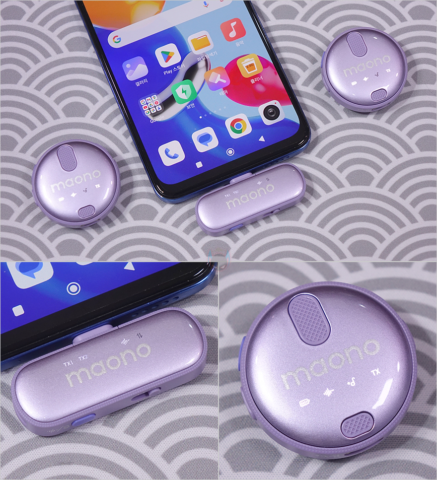 케이스를 열어보면, 송신기(transmitter)인 마이크 2개와 스마트폰에 연결되는 수신기(receiver) 1개가 수납되어 있는데, 케이스 색상에 맞춰서 통일시켰습니다. 스마트폰에 연결되는 송신기 같은경우 앞서 언급했듯이 안드로이드와 애플 iOS에 따라 2가지로 구분되고 있으며, 뒤에 연결 부분에서 확인하겠지만, 수신기 MAONO 로고 부분 위에 표기된 마이크(TX1/TX2), 노이즈 캔슬링, 연결상태 표기 부분은 모두 LED가 적용되어 있습니다. 그리고, 수신기 아랫부분에는 노이즈 캔슬링(Noise cancelling)과 음소거(Mute) 버튼이 배치되어 있으며, 버튼 바로 옆 오른쪽에는 게인 조절 스위치(Gain control switch)가 배치되어 있는데, 앞서 제품박스에서 확인했듯이 4단계 조절을 지원합니다. 또한, 수신기 양쪽 측면에는 각각 USB Type-C 충전 포트와 마이크 모니터링할 수 있는 3.5mm 포트가 적용되어 있죠.