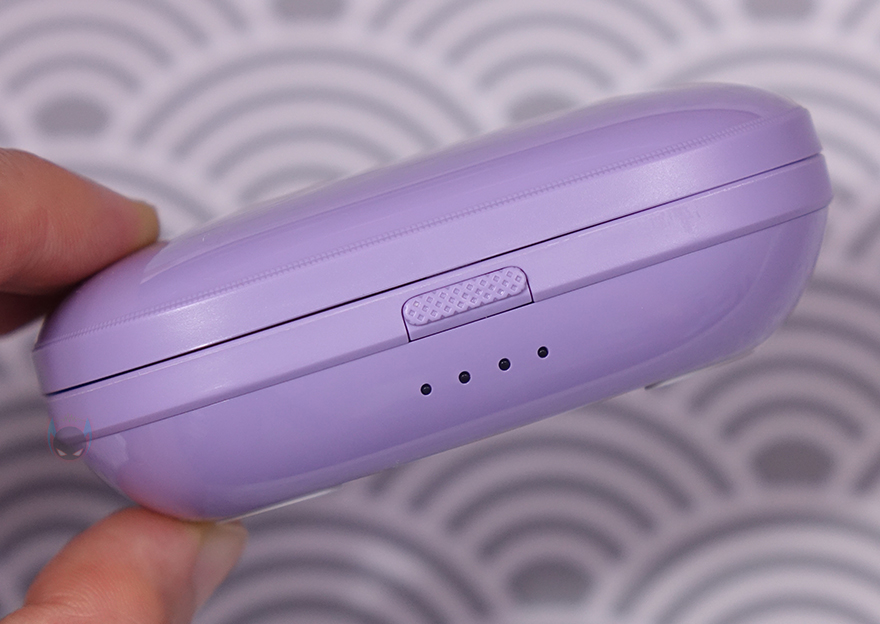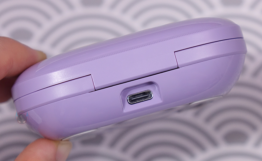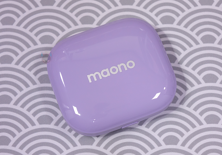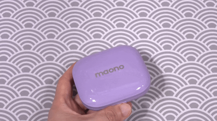 그리고, 충전케이스(Charging Case)부터 살펴보면, 크기는 스마트폰의 절반 수준이며, 무게도 마이크와 수신기가 수납된 상태에서 약 104g밖에 되지 않아 모바일용 무선 마이크답게 휴대성은 최적입니다. 케이스 상판 그러니깐 열리는 뚜껑 부분에는 MAONO 로고(logo)를 새겨놨으며, 아래쪽에 버튼(Button) 방식으로 눌러서 케이스가 열리는 구조를 가졌습니다. 또한, 버튼 바로 아래에는 충전상태를 확인할 수 있는 LED 인디케이터(Indicator)도 적용되어 있죠. 그리고, 뚜껑이 열리는 후면 힌지 부분에는 USB 충전케이블과 연결되는 USB Type-C 포트가 배치되어 있으며, 케이스 밑바닥에는 미끄럼방지의 패드가 기본 부착되어 있습니다.