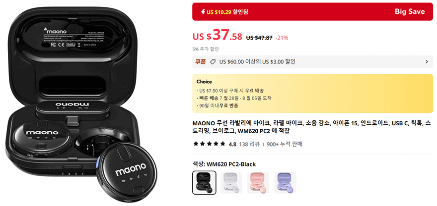 - 스토어 할인쿠폰(1130MAONO) + 할인코드(BF1993, PPOMP03, ALICL03, DAMOANG03, BLACKFRI03, ALIBOX03) = 34.76달러(무료배송)