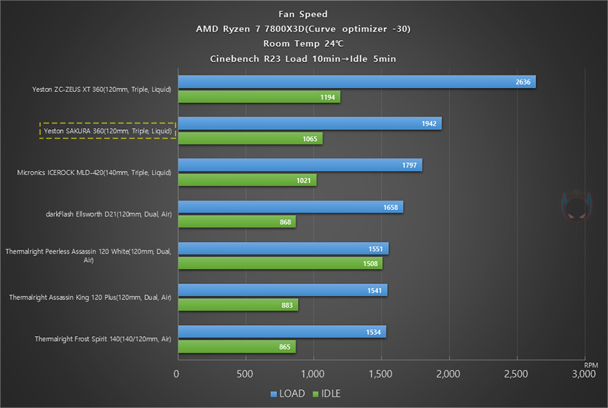 이제, 사쿠라 360 일체형 수랭쿨러(Sakura 360 AIO Liquid Cooler)의 성능을 확인해 보는데, 최근 CPU들은 부스터 클럭이 높게 설정되어 있기 때문에 예전처럼 CPU 오버클럭에 매리트가 떨어집니다. 그래서, 현재 가장 인기 있는 CPU도 AMD 라이젠 7800X3D로 CPU 오버클럭을 지원하지 않죠. 그래서, 라이젠 7800X3D CPU를 사용해 현재 일반적으로 많이 설정하는 커브옵티마이저(-30)를 적용해, Cinebench R23을 통한 10분간의 과부하 Load 상황과 이후 5분간의 Idle 상황에서 CPU 온도와 팬 속도 및 소음, 쿨링성능에 따른 CPU 최대 클럭속도를 확인해 봤습니다.