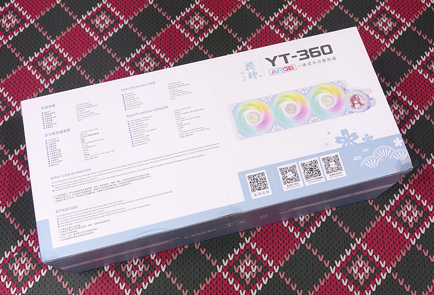 제품박스는 박스 전체가 비닐 밀봉처리된 상태로 소비자 입장에서 판매 제품에 좀 더 신뢰를 가질 수 있도록 했습니다. 그리고, 제품 박스에서 이 제품은 사쿠라 시리즈(Sakura series) 제품군이라는 걸 알 수 있게 전면에 캐릭터(character)를 담고 있죠. 물론, 모델명도 확인할 수 있는데, 정식 명칭은 YT-360으로 YT는 Yeston의 약자인걸 쉽게 짐작할 수 있으며, ARGB 표기도 확인할 수 있습니다.