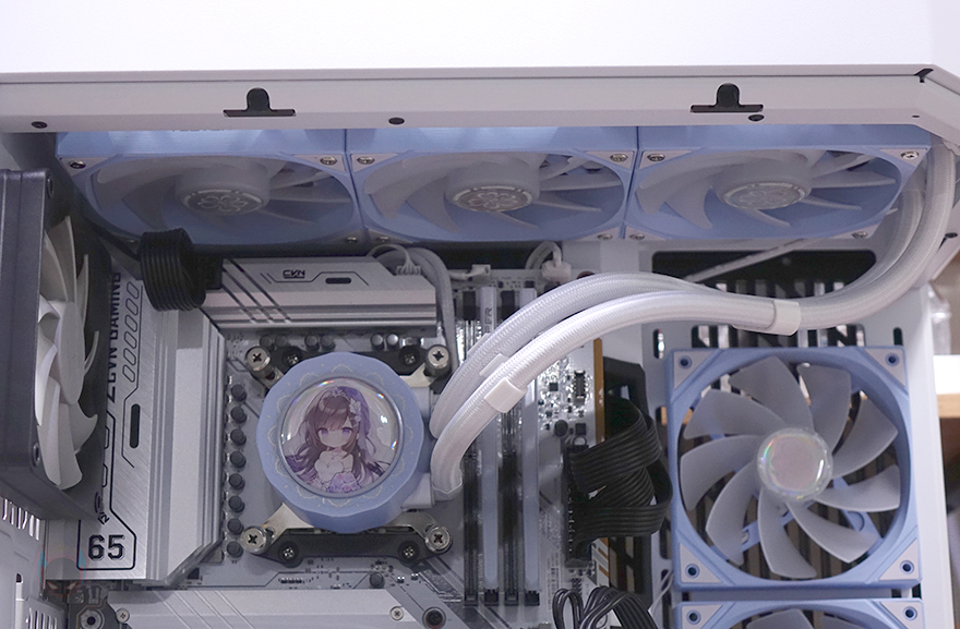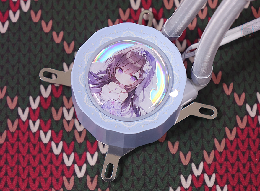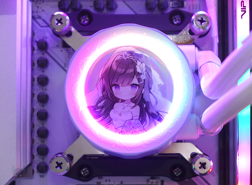쿨러를 장착한 후, PC를 켜면 바로 라디에이터에 장착된 3개의 팬과 워터블록에 사쿠라 캐릭터 주변 링 디자인 부분에서 RGB 라이트 효과를 확인할 수 있습니다. 또한, 앞서 확인했듯이 RGB 작동은 모두 3 pin ARGB 방식이라 메인보드에 5V ARGB 헤더가 있을 시 연결하면 메인보드 RGB Sync와도 완벽하게 연동되며, 다양한 RGB 모드로 변경할 수 있죠.