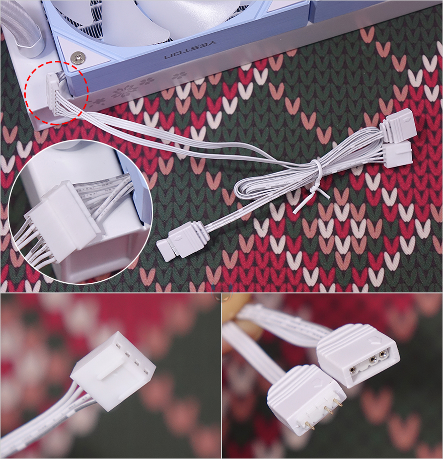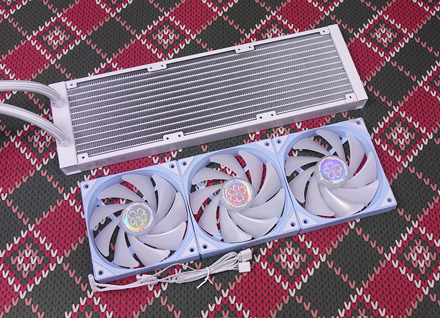 그럼, 본격적으로 YESTON의 사쿠라 360 일체형 수랭쿨러(Sakura 360 AIO Liquid Cooler)를 살펴보는데, 먼저 라디에이터 부분에는 요즘 제품들처럼 팬이 기본 장착되어 있습니다. 360mm 라디에이터를 사용했기 때문에, 팬은 모두 120mm 크기이며, 앞서 언급했듯이 팬 디자인은 앞서 만났던 사쿠라 케이스 팬(Sakura Case Fan)과 동일합니다. 9개의 날개(Blade)와 가운데 홀로그램(hologram) 디자인으로 꽃문양을 적용했죠. 팬 나사 부근에는 모두 방진패드도 부착되어 있으며, 팬 한쪽에는 케이블을 확인할 수 있는데, 연장선 케이블로 3개의 팬이 모두 연결된 상태에서 메인보드에 연결할 케이블로 깔끔하게 정리했습니다. 일종의 데이지 체인(daisy chain)방식을 적용한 거죠. 당연히 팬 작동은 4 pin PWM 방식이고, ARGB를 지원하기 때문에 3 pin RGB 커넥터도 갖추고 있습니다.