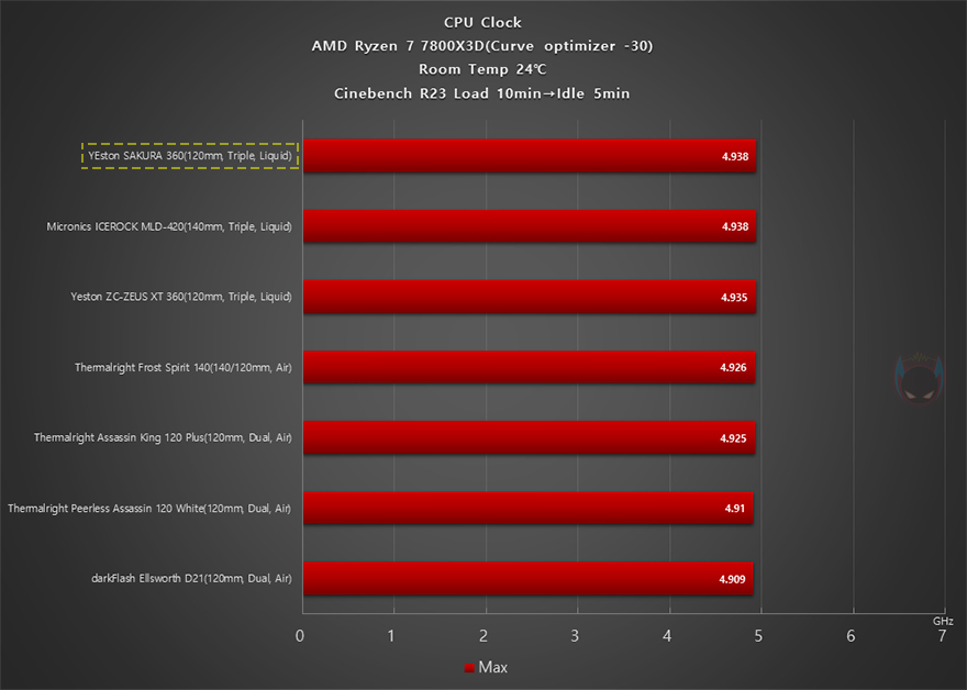 먼저, CPU 온도를 통해 사쿠라 360 일체형 수랭쿨러(Sakura 360 AIO Liquid Cooler)의 쿨링 성능을 확인해보면, 비교 모델들 중 가장 낮은 온도를 보여줍니다. Load와 Idle 상황 모두에서 가장 낮은 온도를 보여주며, 뛰어난 쿨링 성능을 자랑하죠. 특히, 팬 속도와 소음까지 확인해보면, 이 제품의 쿨링 성능이 좀 더 매리트있게 느껴지는데, 앞서 언급했듯이 라디에이터에 기본 장착된 팬은 800~2000RPM 속도 범위로 작동합니다. 과부하시 최대 속도에 근접하게 작동하는걸 확인할 수 있으며, 5분간 Idle 구간에선 약 1000RPM대로 작동되는걸 확인할 수 있죠. 그리고, 이때 소음을 확인해보면, Load 상황에서 소음이 다소 있는 편이지만, Idle에선 가장 낮은 소음대를 보여줍니다. 즉, 팬 속도와 소음대비 쿨링 성능이 좋다라는걸 알 수 있죠. 끝으로, 쿨링성능이 뒷받침되기때문에, 라이젠 7800X3D의 최대 클럭작동도 비교 모델 중에서 가장 높게 작동되는걸 확인할 수 있습니다.
