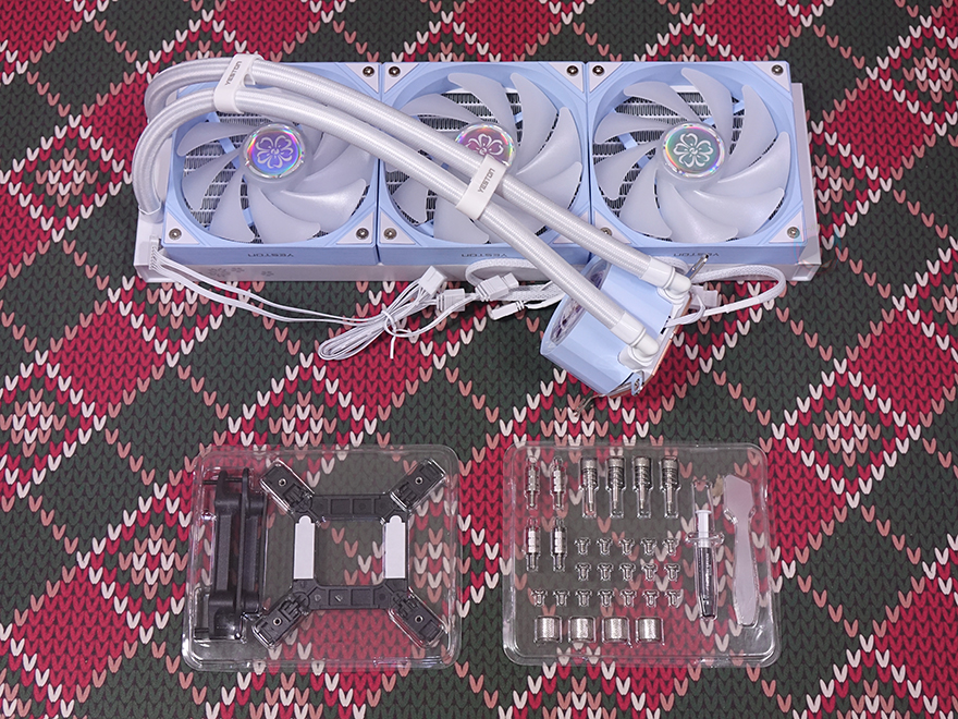 제품 박스를 열어보면, 다른 일체형 수랭 쿨러 제품들과 마찬가지로 구성품이 담긴 포장 위에는 우레탄-폼 완충재를 사용했으며, 쿨러는 비닐 포장 되어 있습니다. 구성품은 사쿠라 360 일체형 수랭쿨러와 부속품으로 이루어져 있는데, 부속품 같은 경우에도 일반적인 비닐 포장이 아니라 부품별 크기에 맞춘 캡(Cap) 방식으로 포장해 깔끔하고 분실우려도 없습니다.